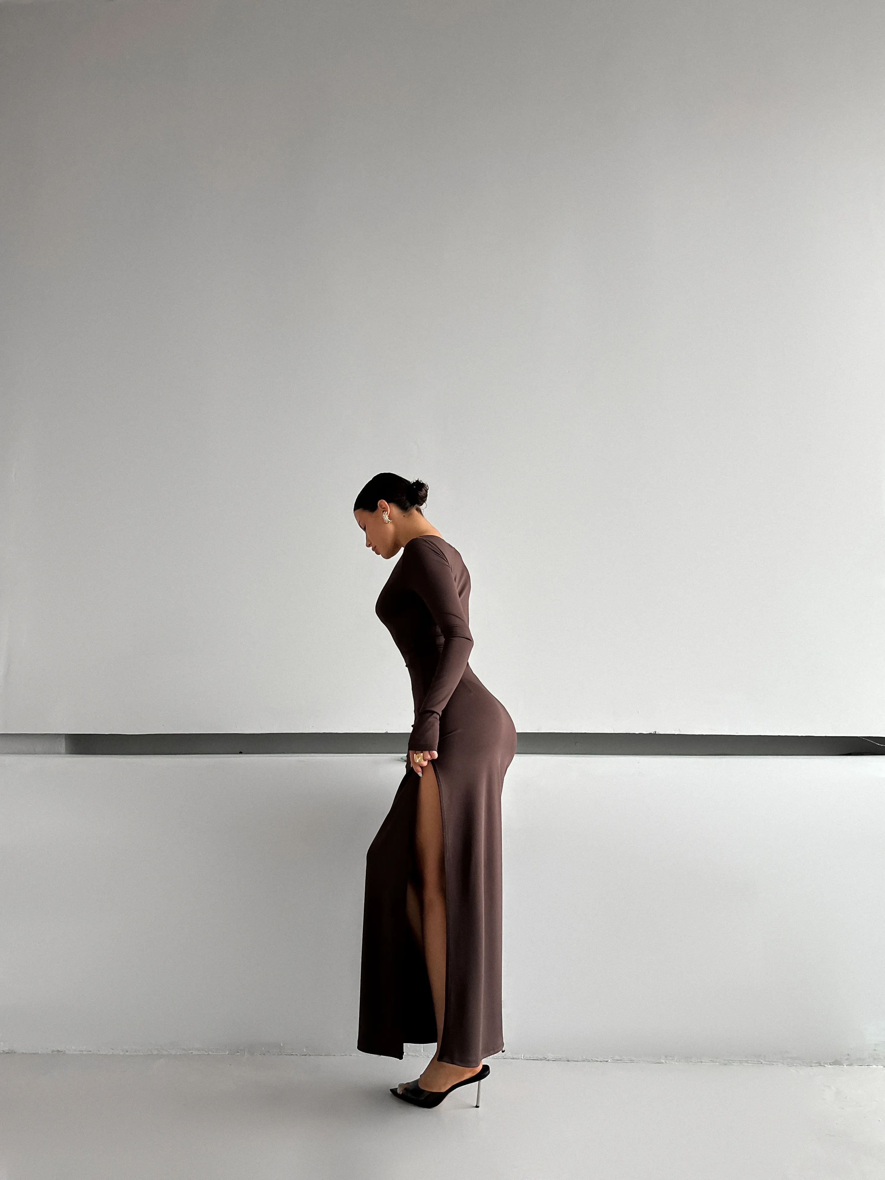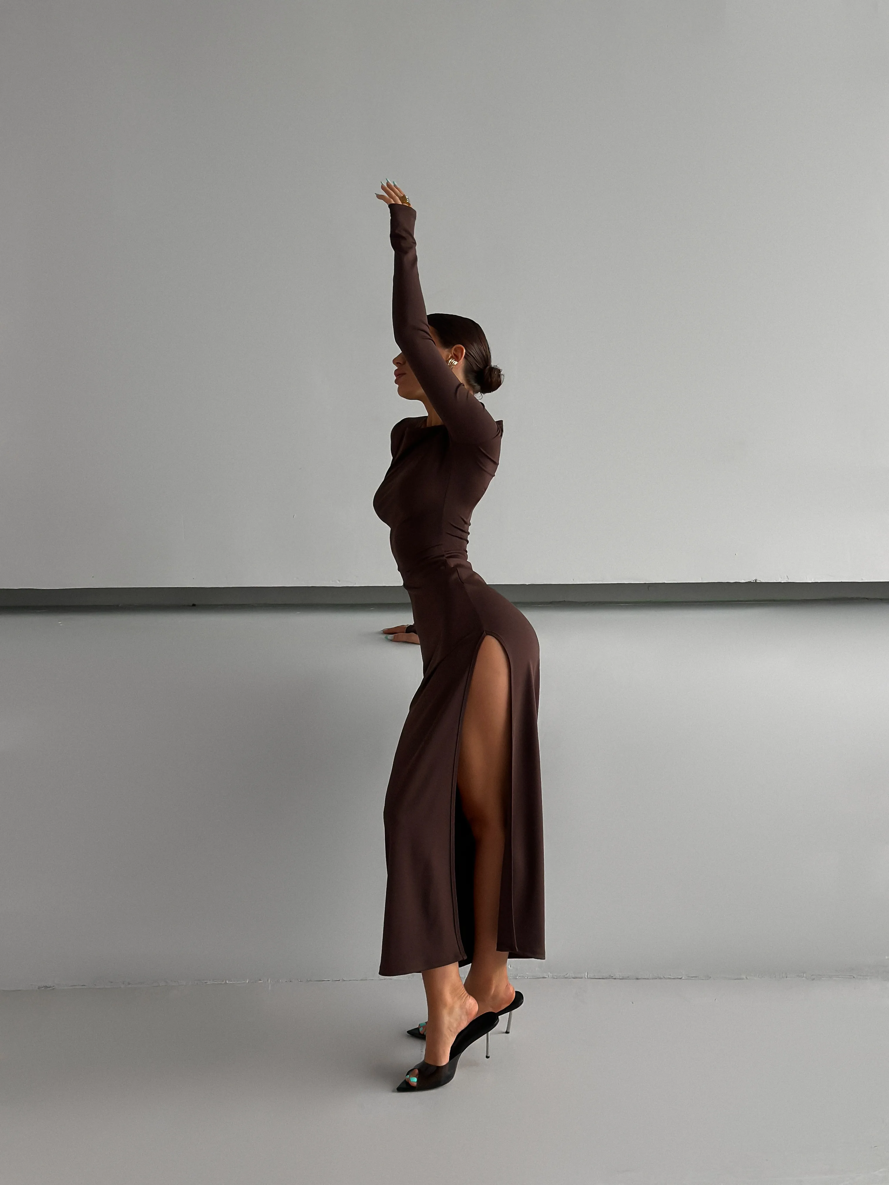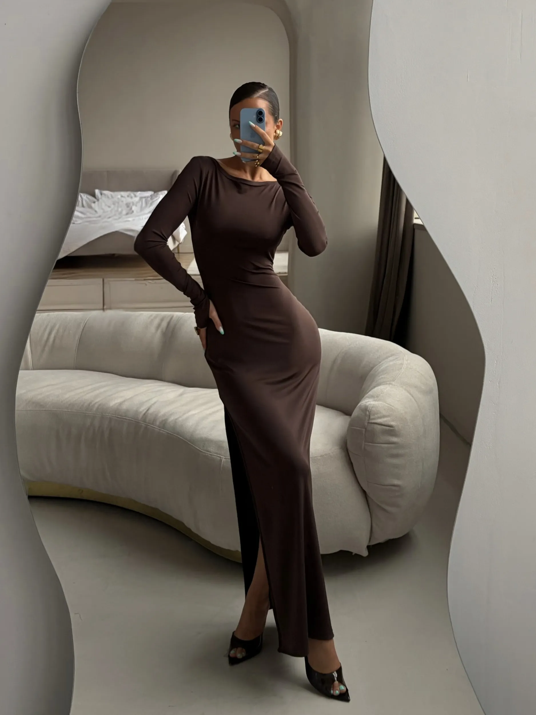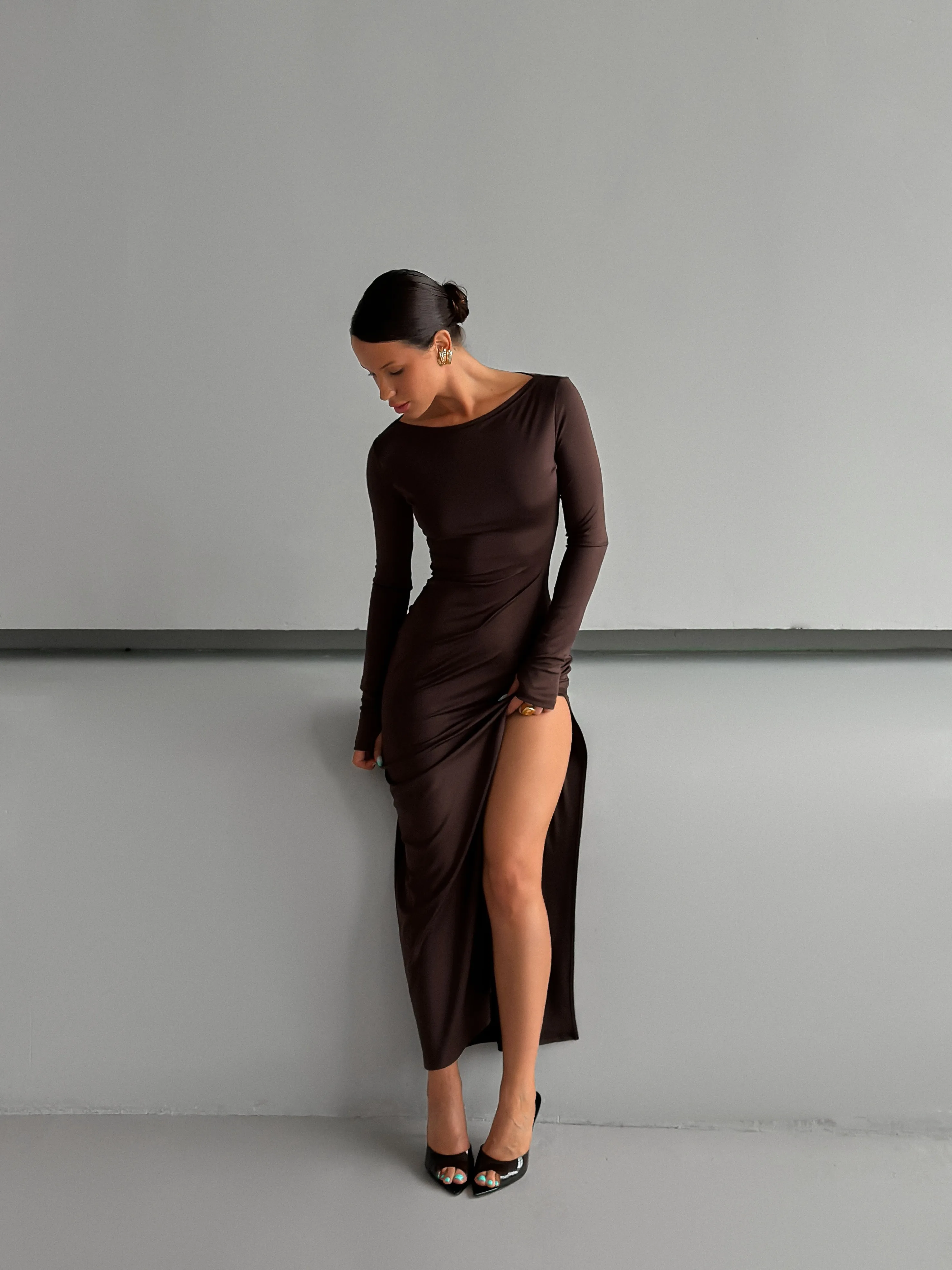 Платье в длине макси приталенного силуэта из гладкого бифлекса с акцентным разрезом от бедра