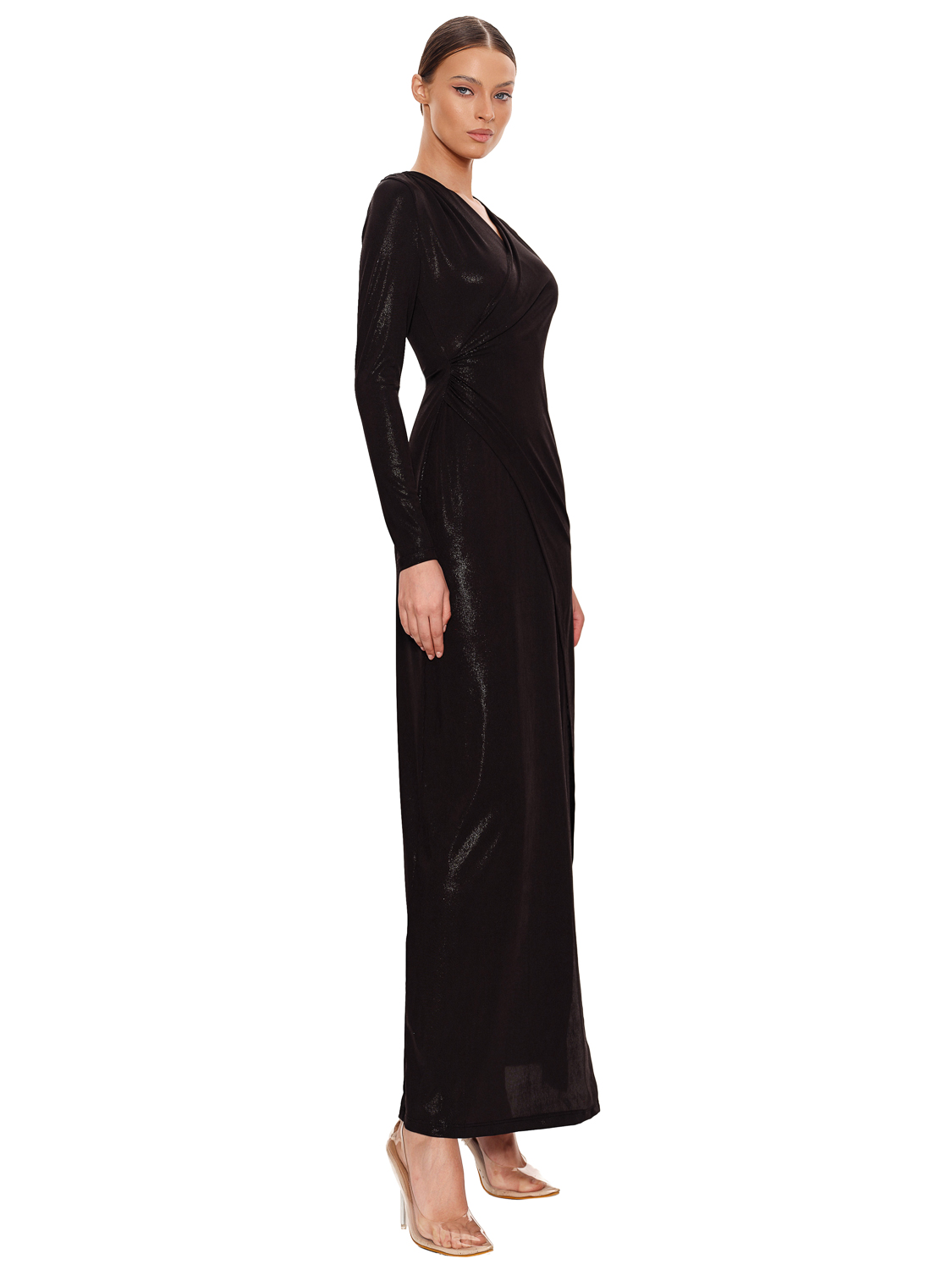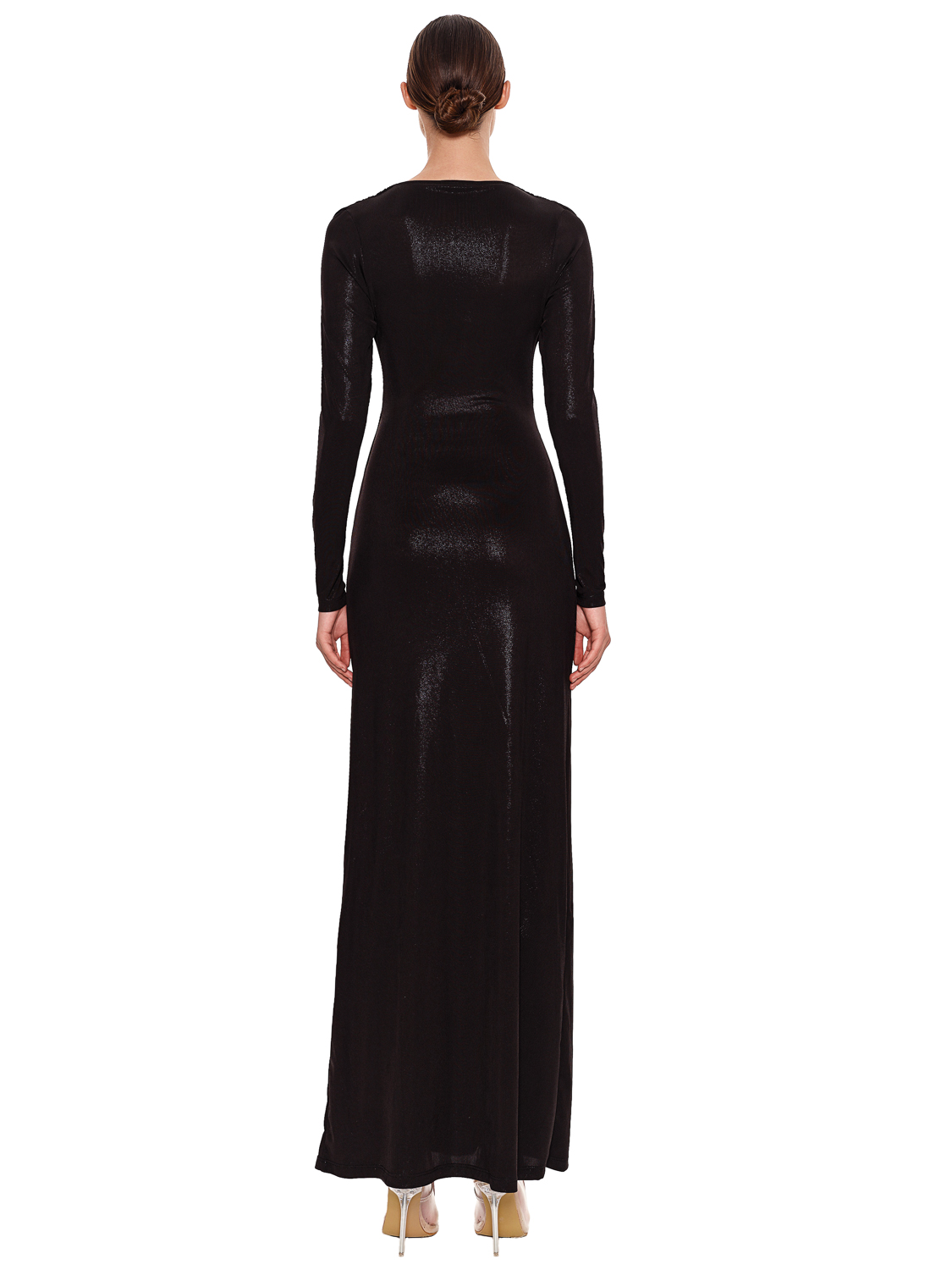 Платье макси выполнено из лёгкой, приятной к телу ткани с деликатным блеском. Материал сверкает при дневном и вечернем свете. Центральная деталь декора — запах с фиксацией в области талии. Лаконичный вырез, эффектный разрез до высшей точки бедра по линии ноги, свободный низ, который в движении создаёт красивый эффект. Роскошь и само совершенство — твой невероятный аутфит для праздника, выхода в свет, вечера, особого случая.
