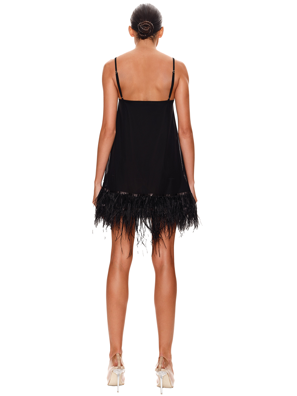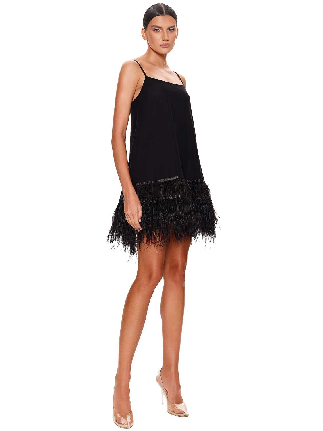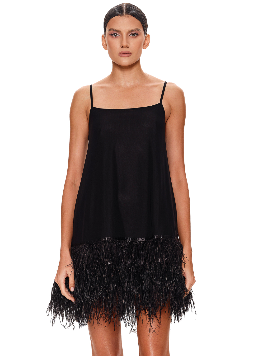 Роскошный аутфит для самых концептуальных образов. Модель А-силуэта декорирована лентой из перьев по нижнему краю модели. Свободный крой, тонкие бретели со слайдерами с возможностью коррекции посадки и максимум женствености. Идеальный вариант для вечернего выхода «night out», особого случая, корпоративного вечера, новогодней ночи. Акцентный макияж, обувь на подъёме и ваша уникальность в фокусе внимания!
