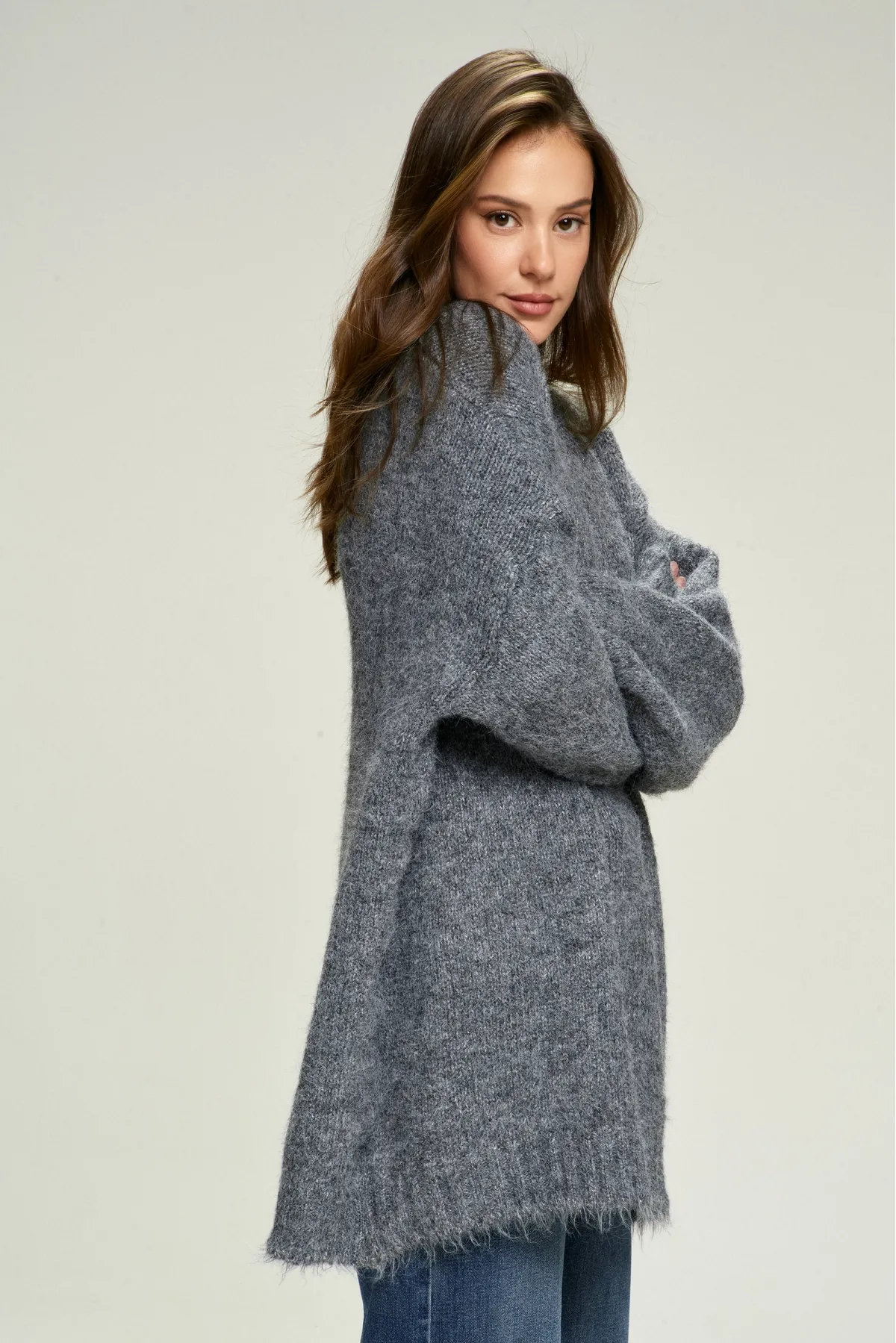 Просторный и тёплый джемпер напоминает дедушкин свитер. Мягкий, ворсистый, с уютной фактурой, которая так и манит завернуться в него. Идеальная длина для тех, кто любит комфорт и свободу движений.