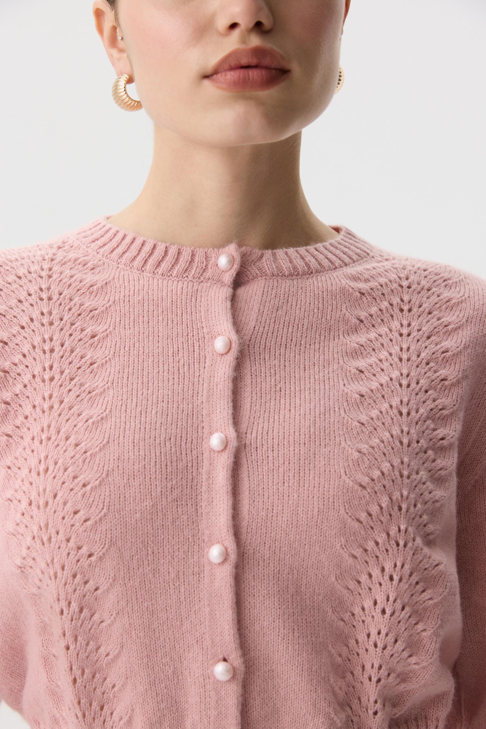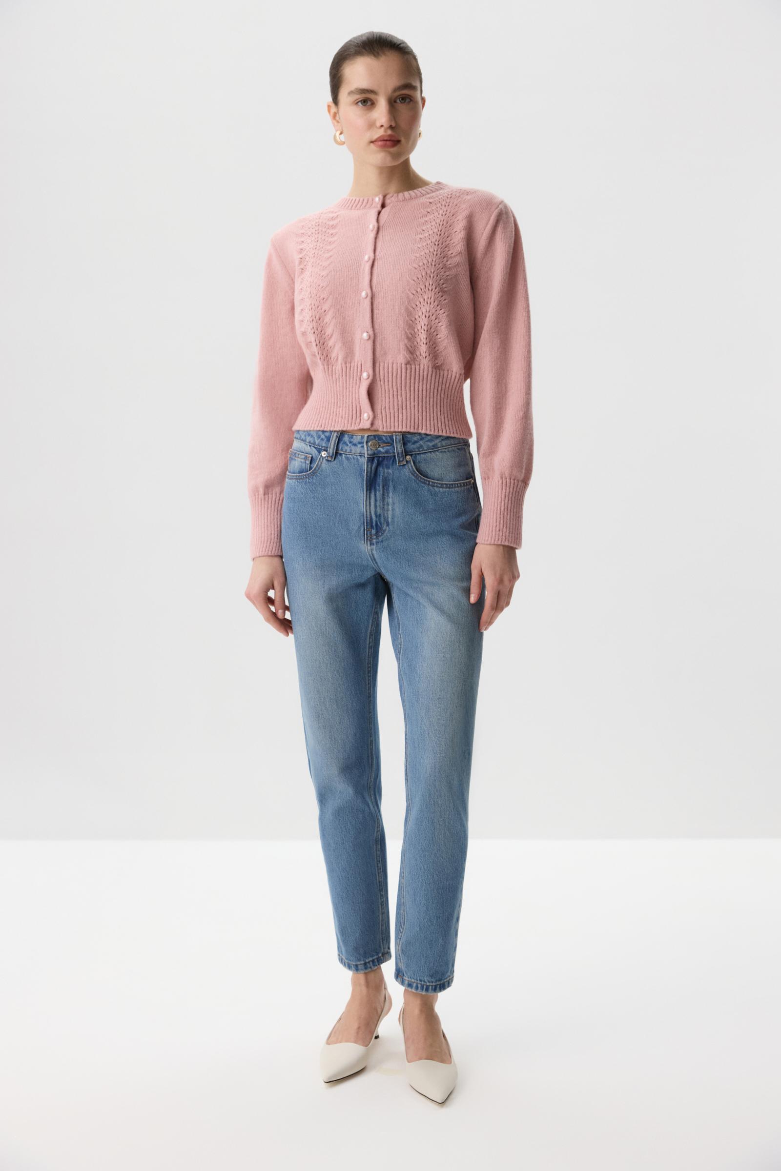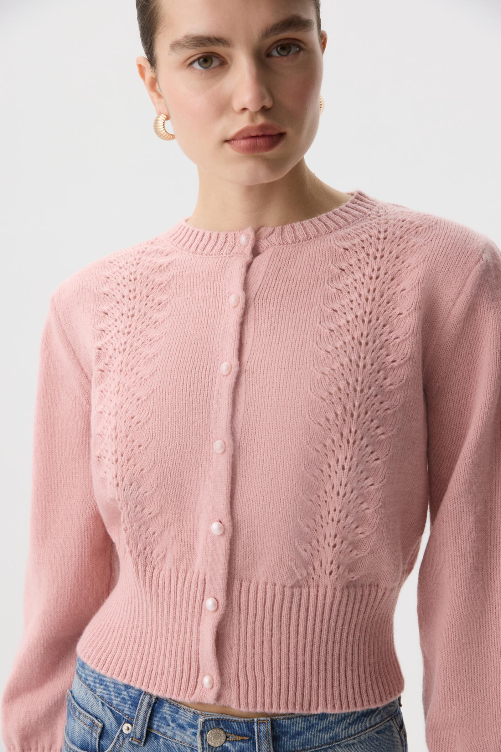 Кардиган с длинными рукавами, дополненный декоративным ажурным узором. Застежка на петли и аккуратные пуговицы - жемчужины в тон изделию, что придает модели игривое настроение и добавляет акцент на детали. Высокий риб по низу изделия сажает его по фигуре и подчеркивает талию.