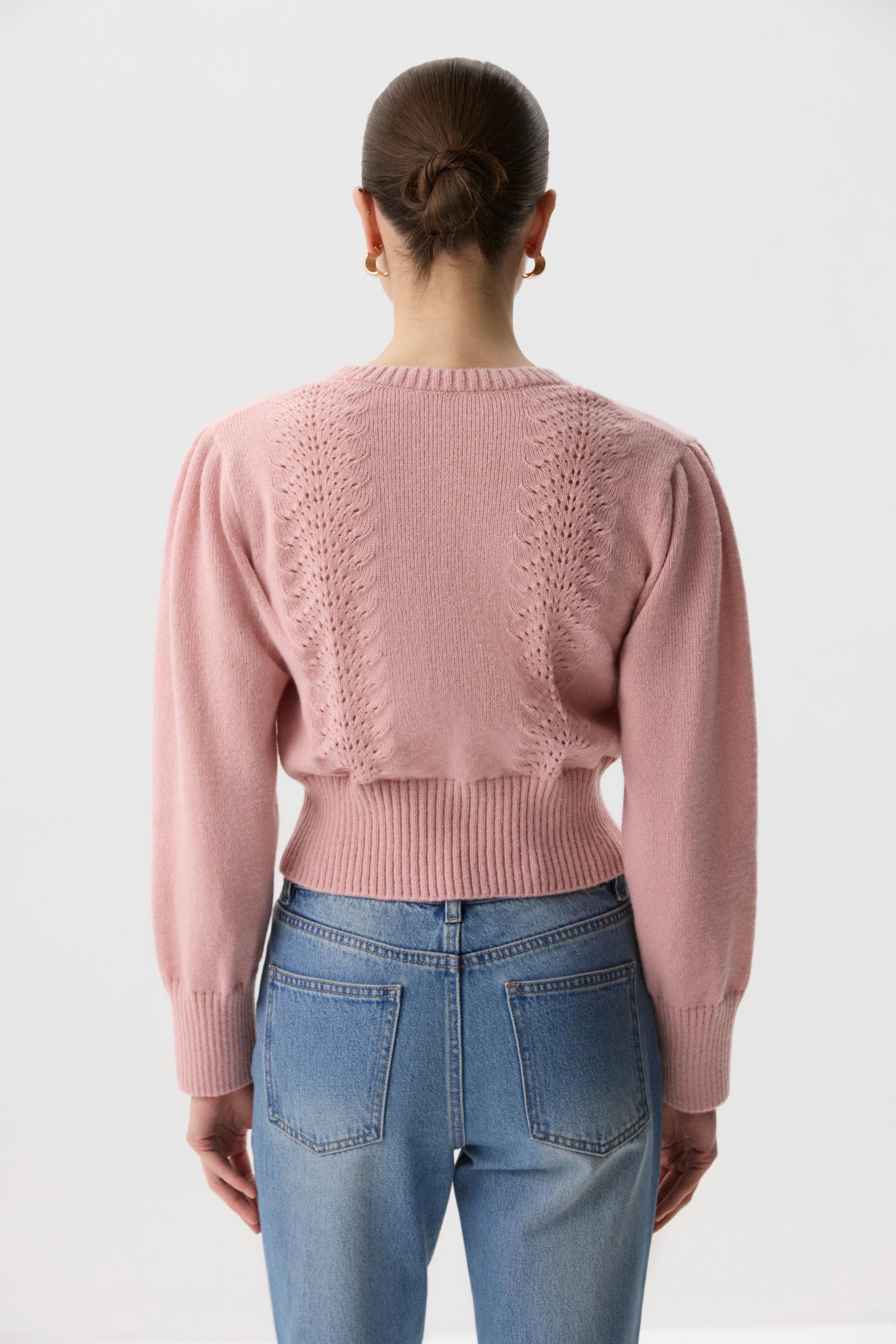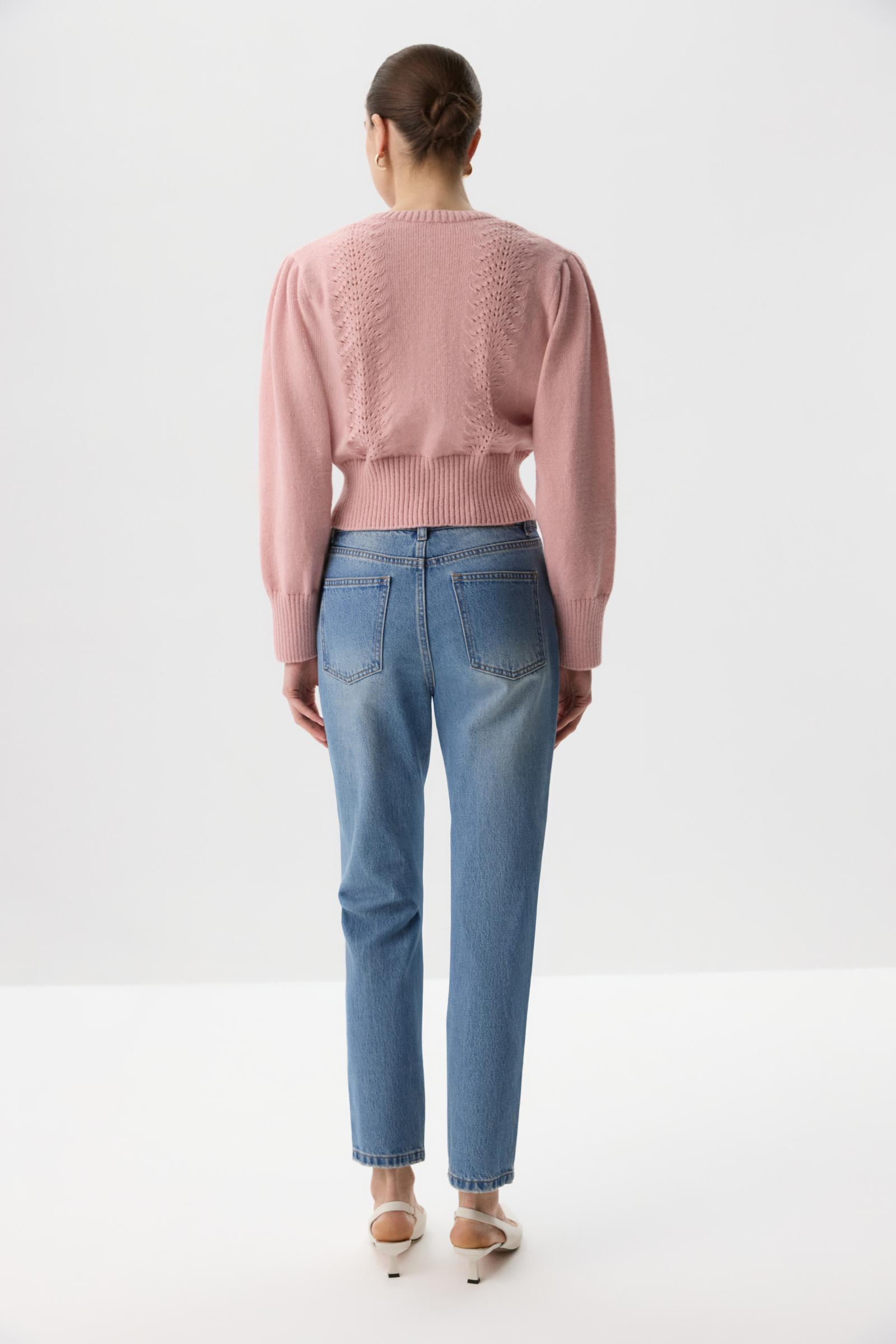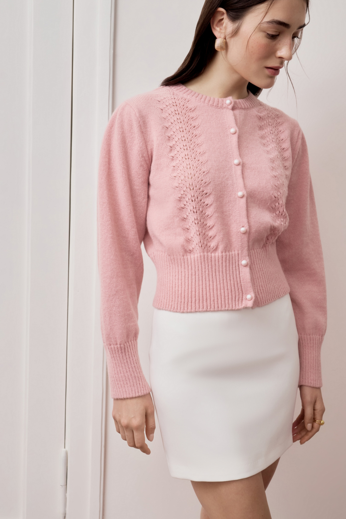 Кардиган с длинными рукавами, дополненный декоративным ажурным узором. Застежка на петли и аккуратные пуговицы - жемчужины в тон изделию, что придает модели игривое настроение и добавляет акцент на детали. Высокий риб по низу изделия сажает его по фигуре и подчеркивает талию.