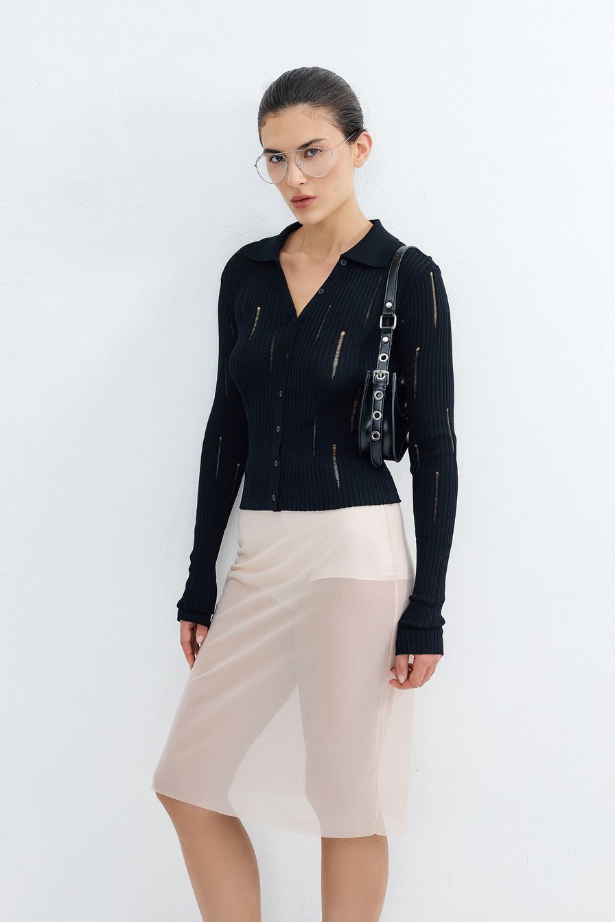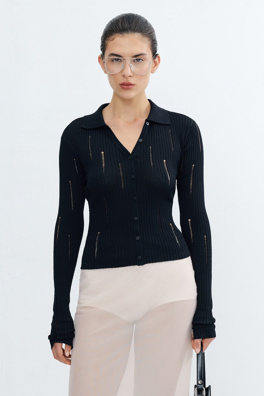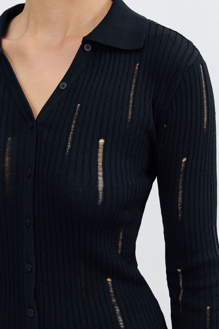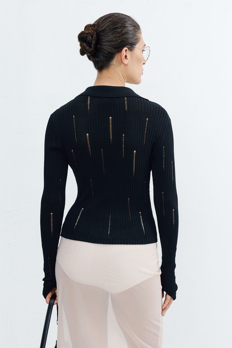 Черный джемпер из смесовой вискозы с распущенной вязкой – модель облегающего кроя. Джемпер дополнен отложным воротником и застежкой на пуговицы.