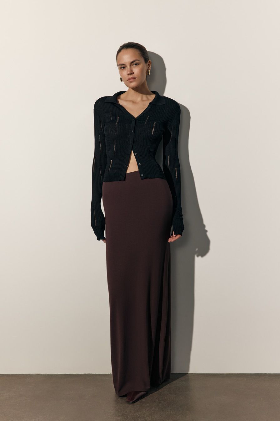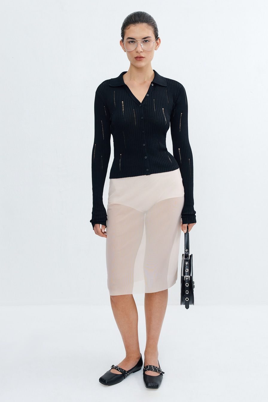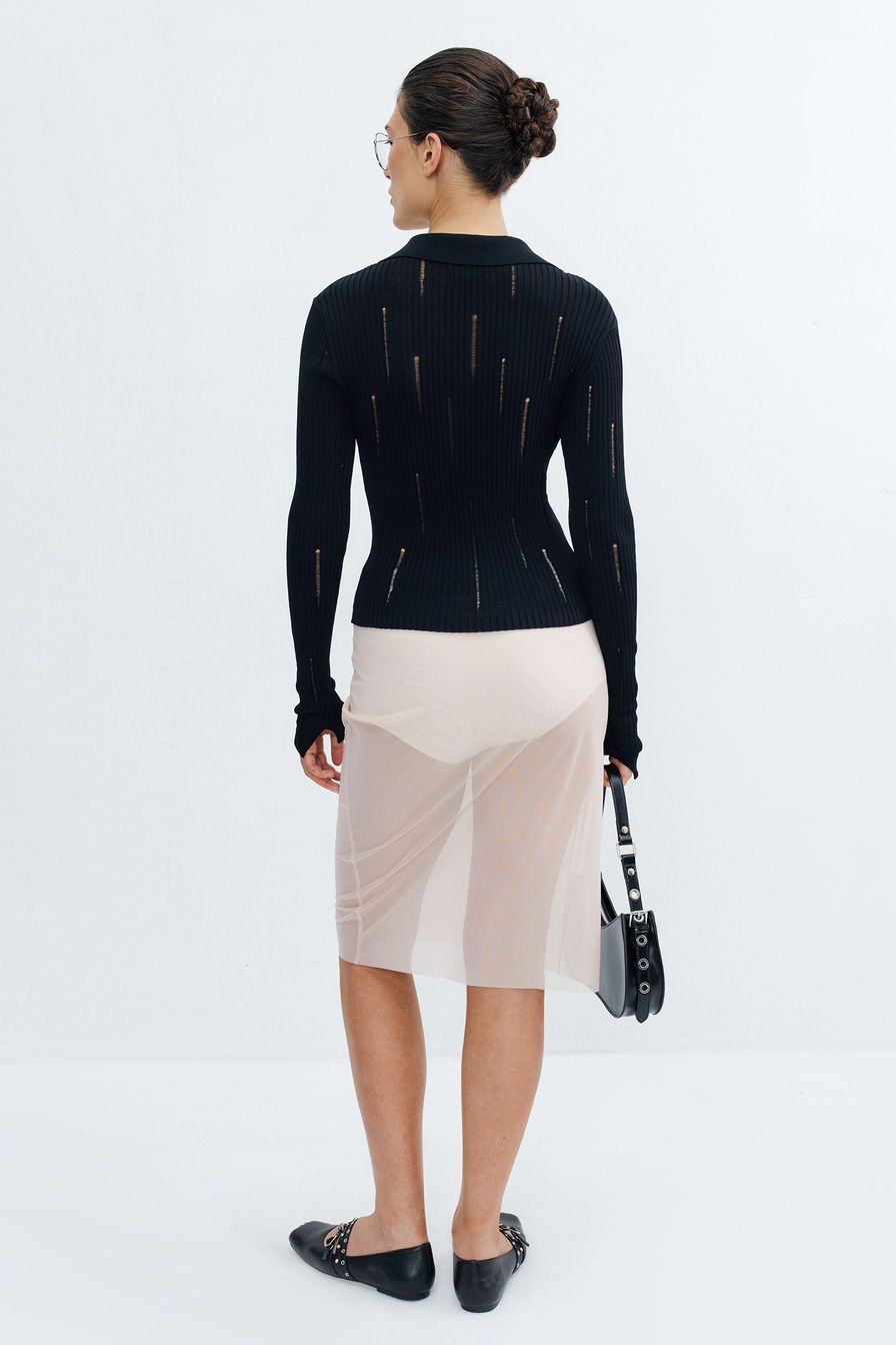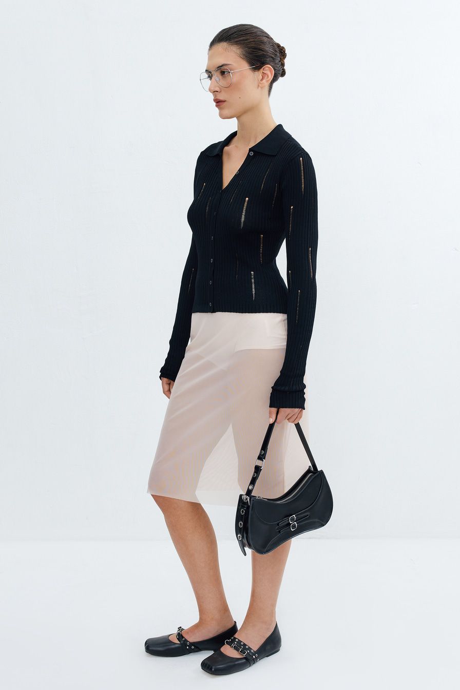 Черный джемпер из смесовой вискозы с распущенной вязкой – модель облегающего кроя. Джемпер дополнен отложным воротником и застежкой на пуговицы.