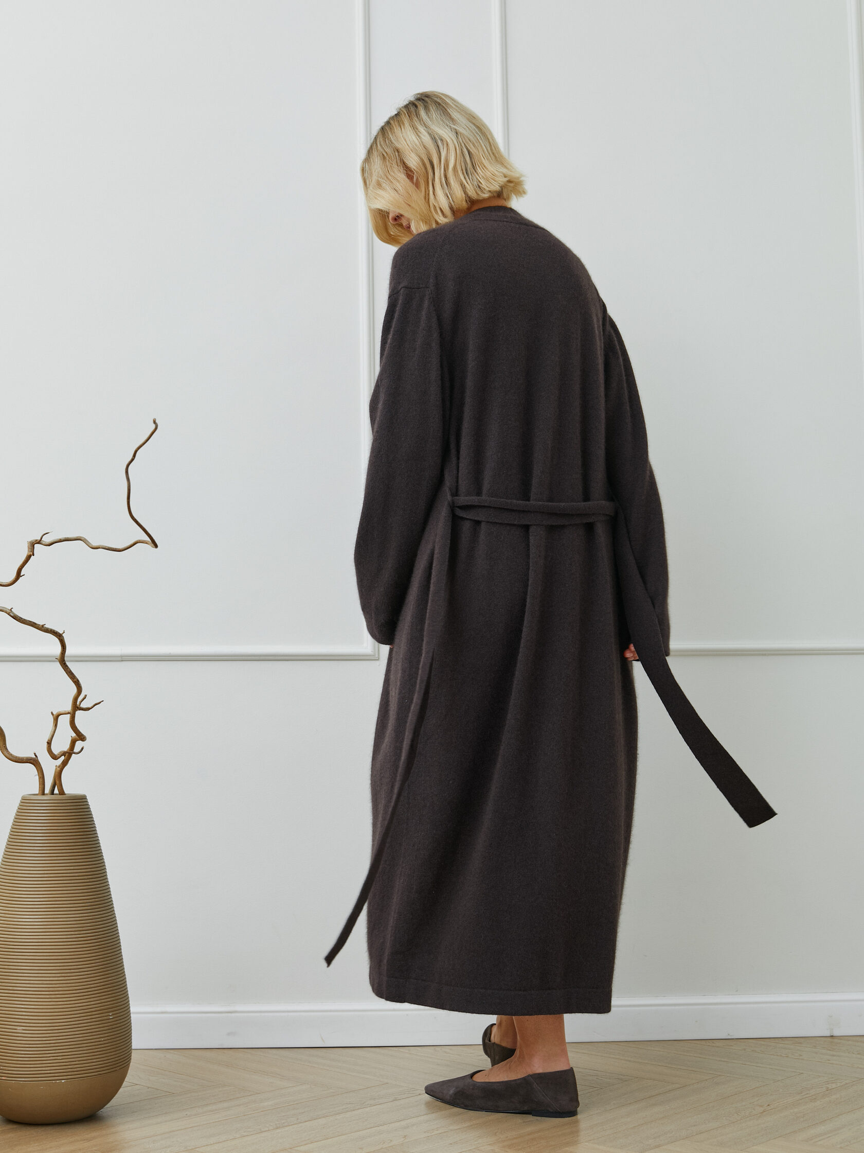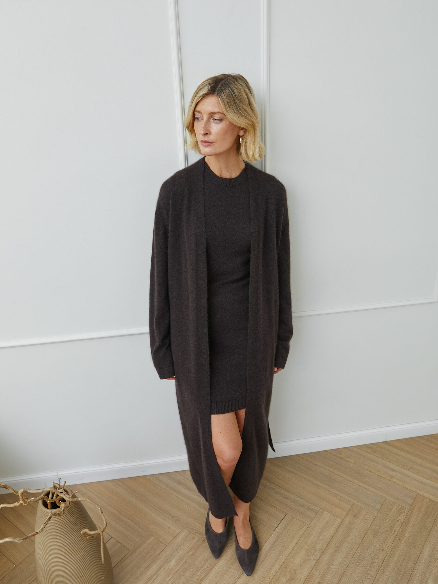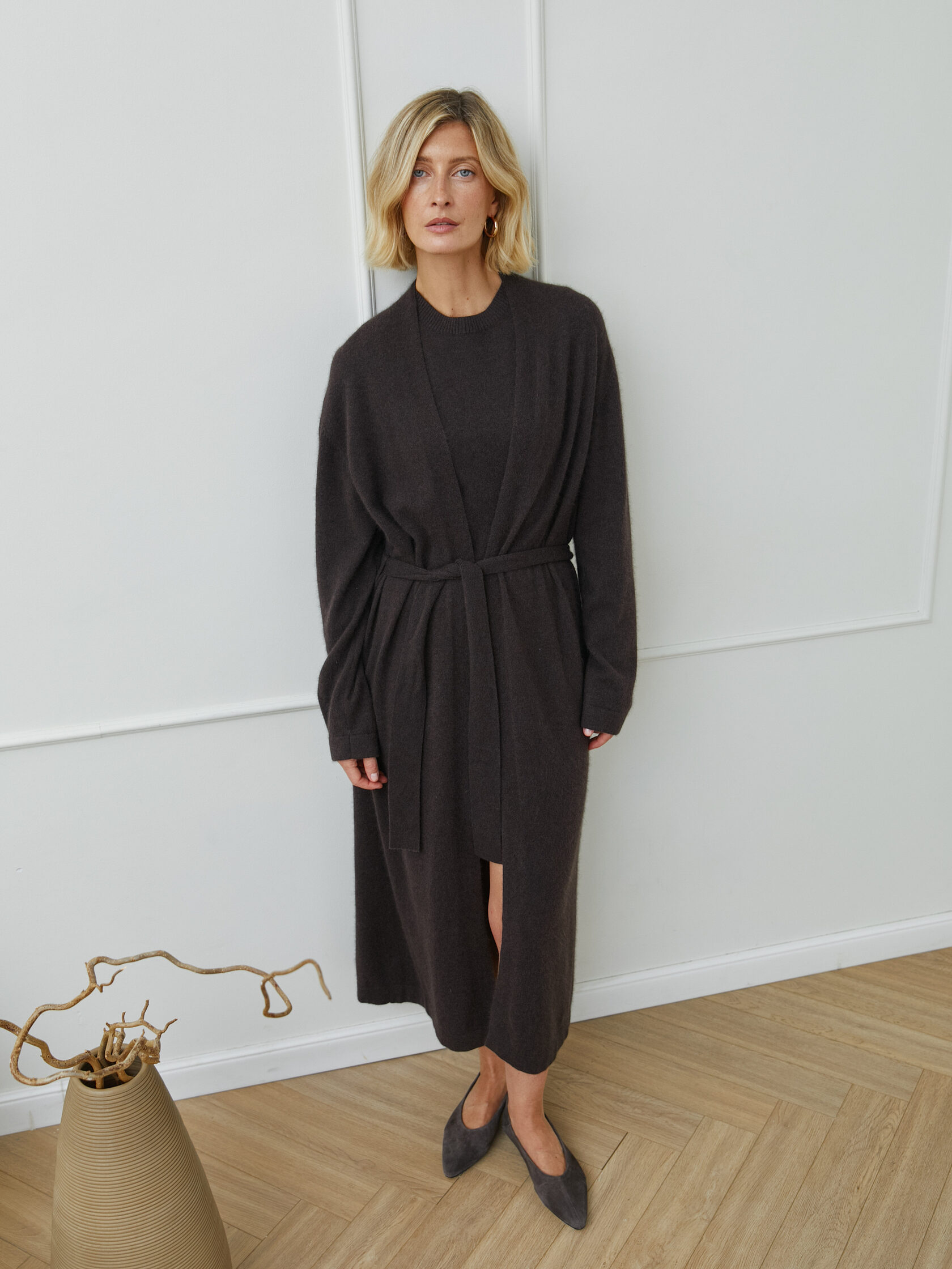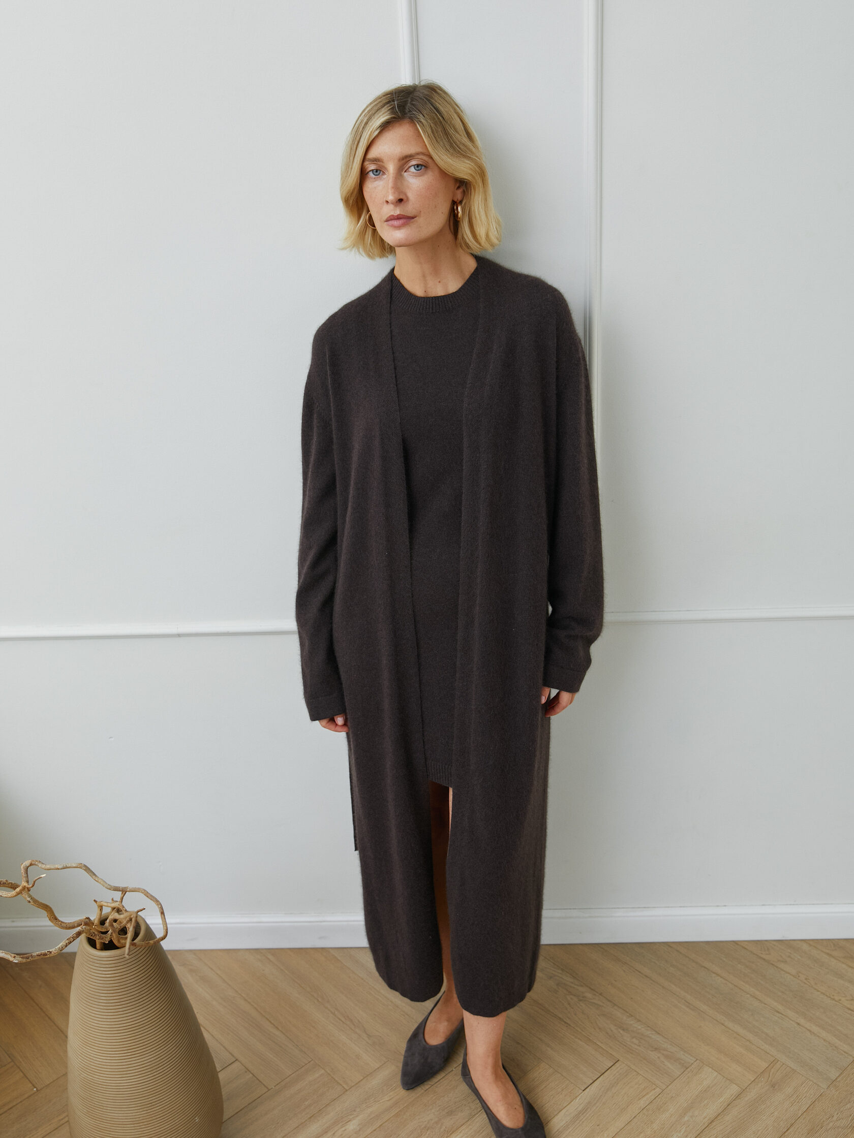 Длинный кардиган выполнен из шерсти енота, приятен на ощупь и отлично сохраняет тепло. Коричневый цвет кардигана универсален и легко впишется в ваш гардероб. Дополнен поясом, что позволяет подчеркнуть талию и добавить стильный акцент в образ.