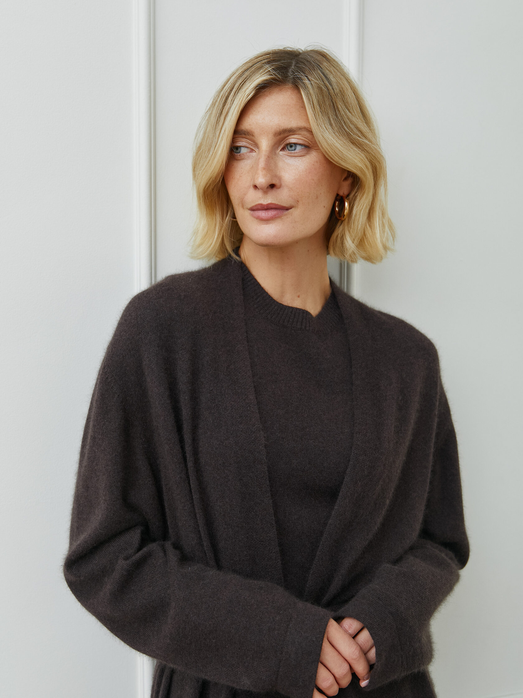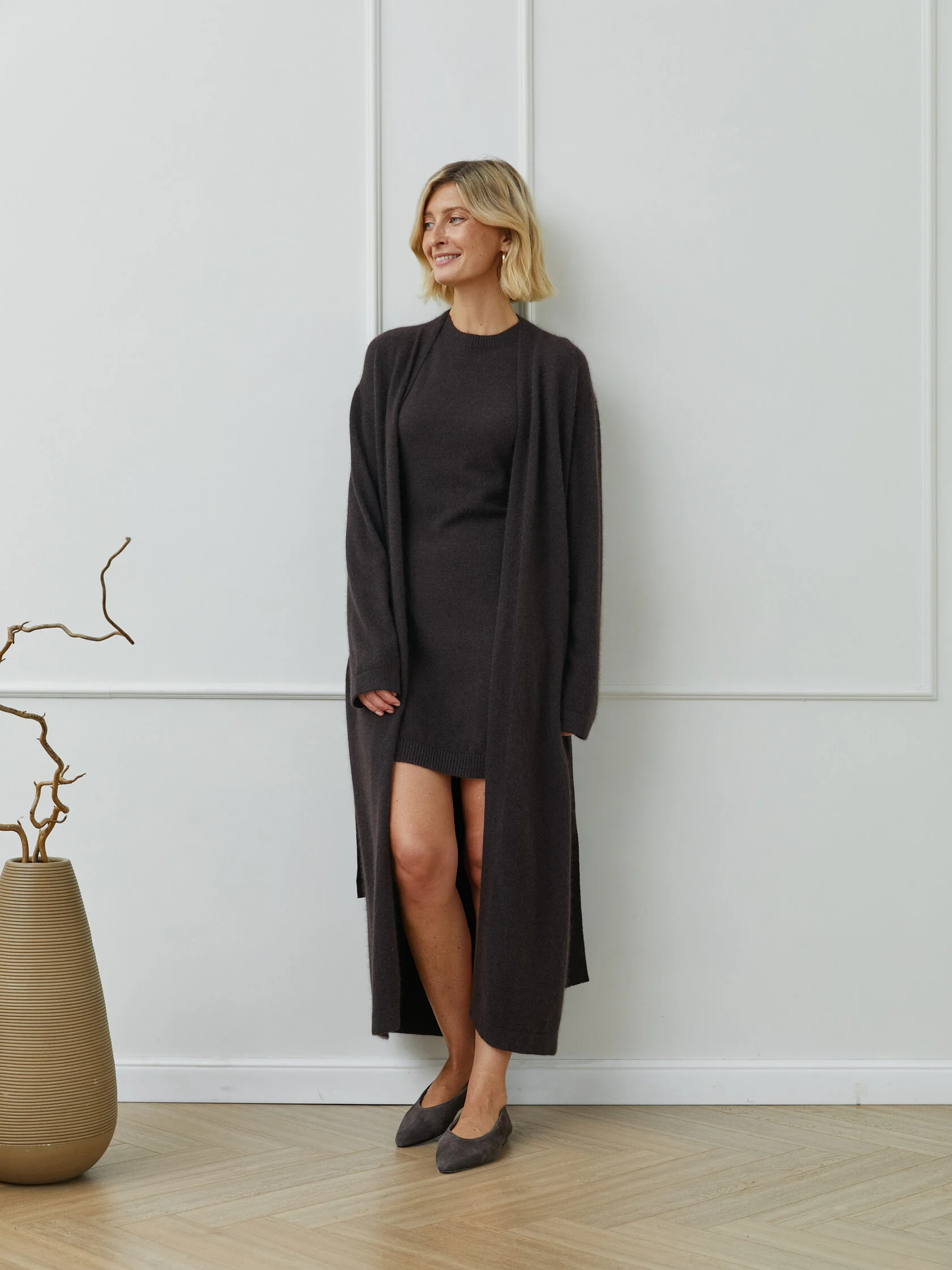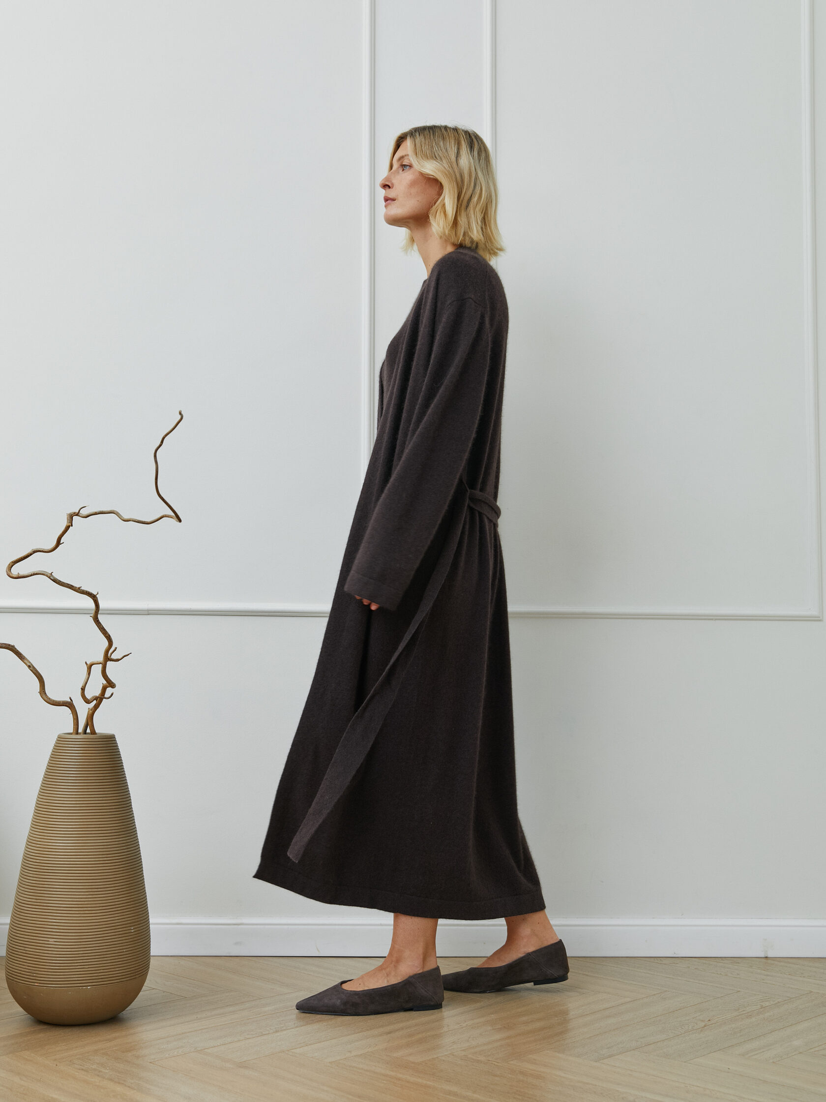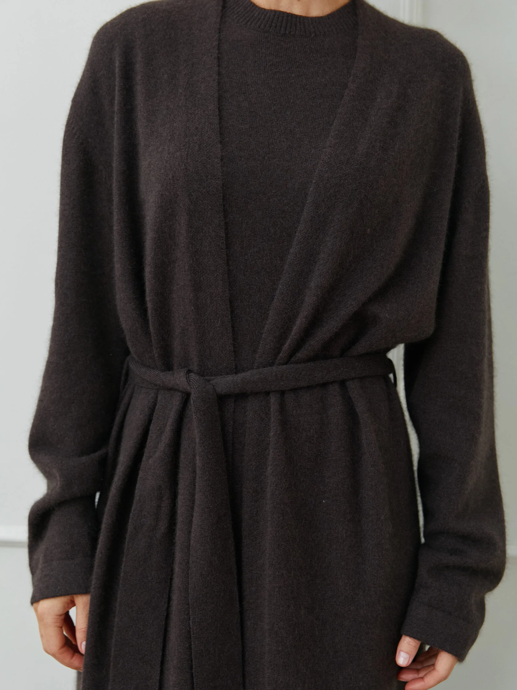 Длинный кардиган выполнен из шерсти енота, приятен на ощупь и отлично сохраняет тепло. Коричневый цвет кардигана универсален и легко впишется в ваш гардероб. Дополнен поясом, что позволяет подчеркнуть талию и добавить стильный акцент в образ.