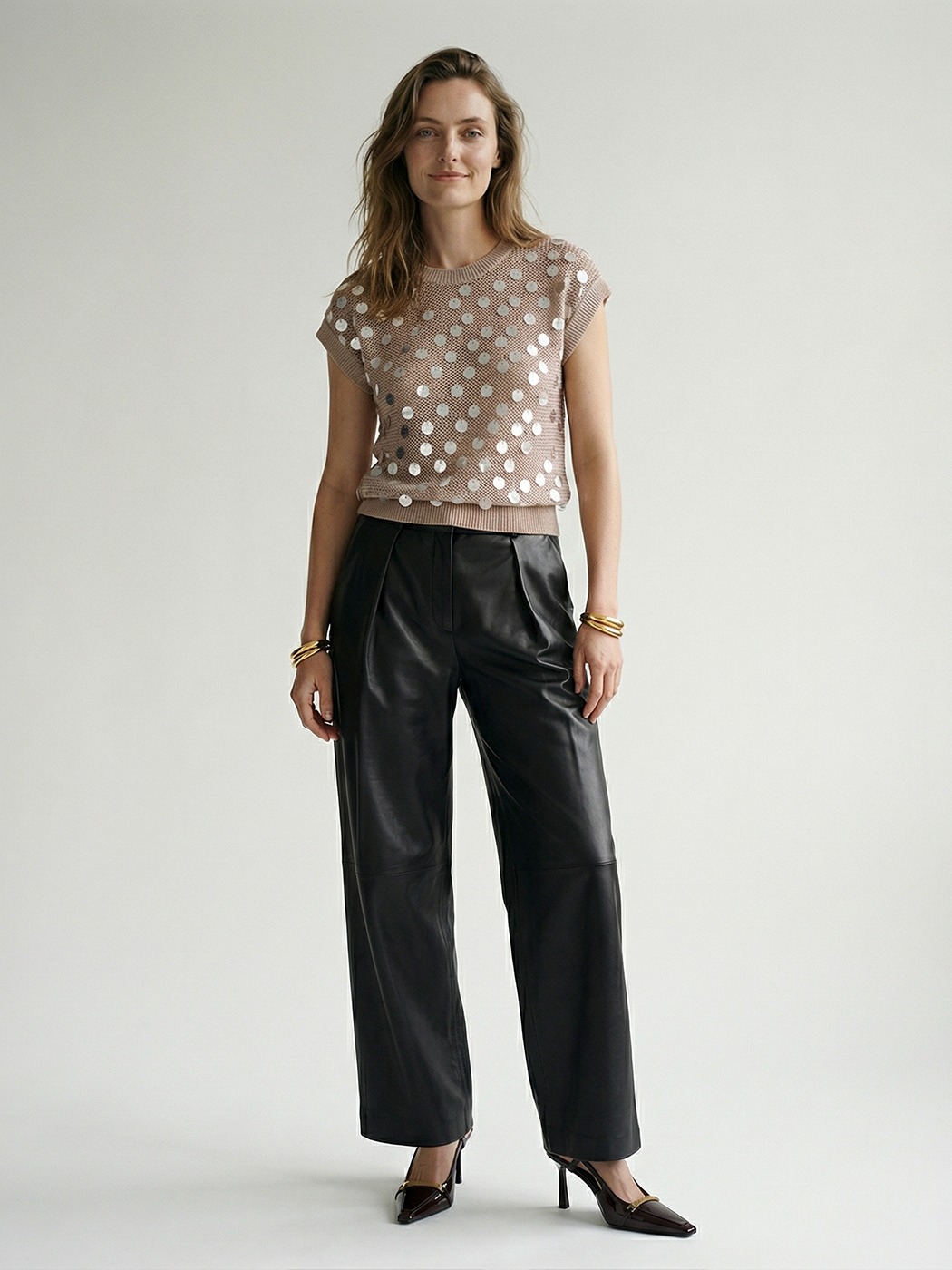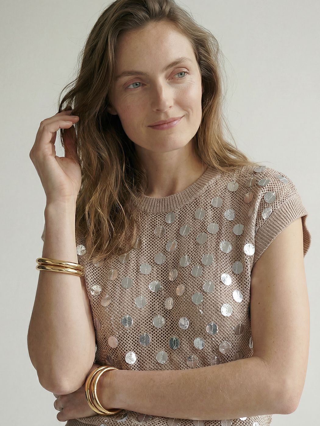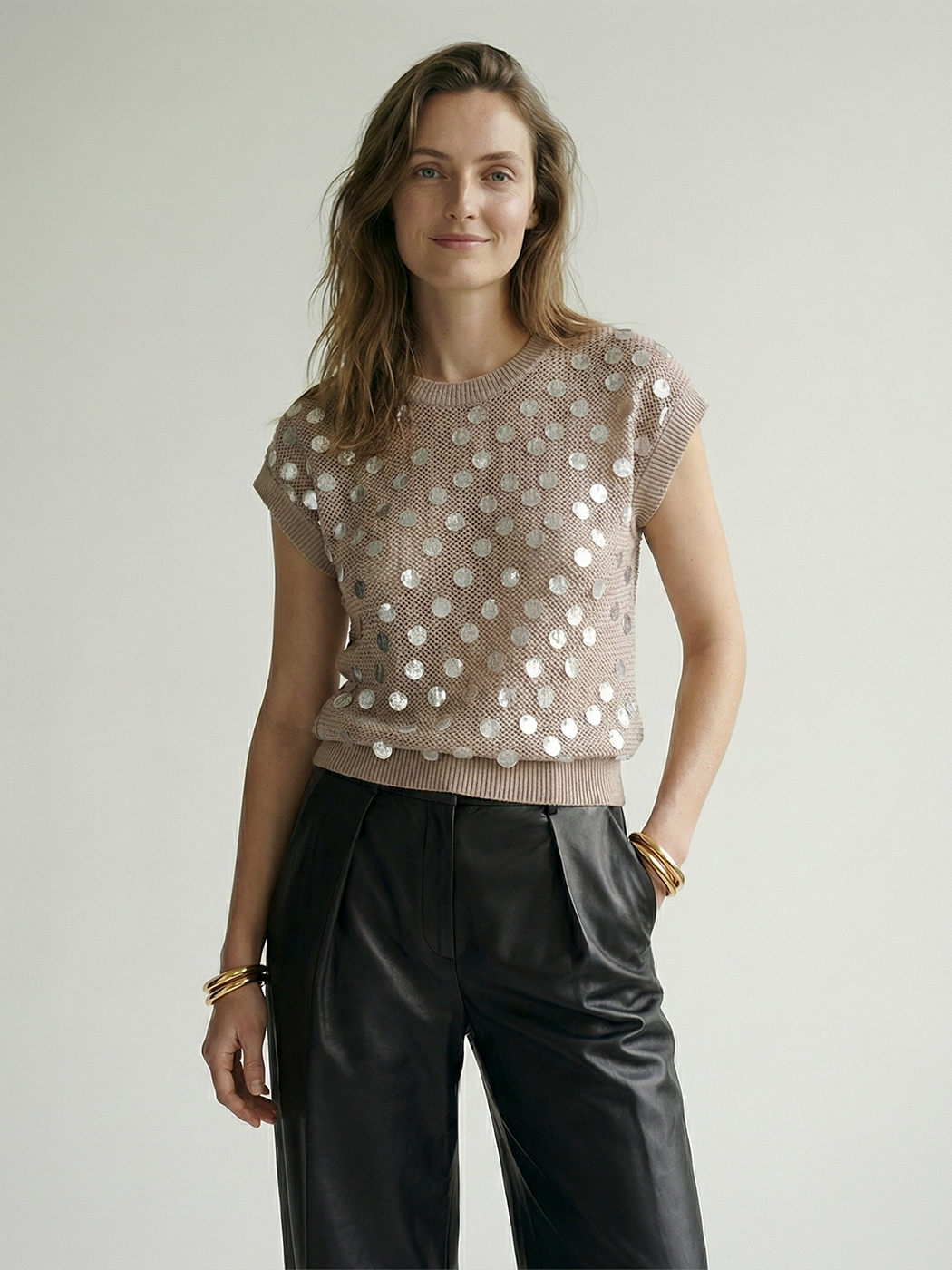 Кофта с пайетками светло-коричневого цвета — это стильный и яркий элемент гардероба. Она добавит образу оригинальности и станет отличным выбором для создания запоминающихся образов.