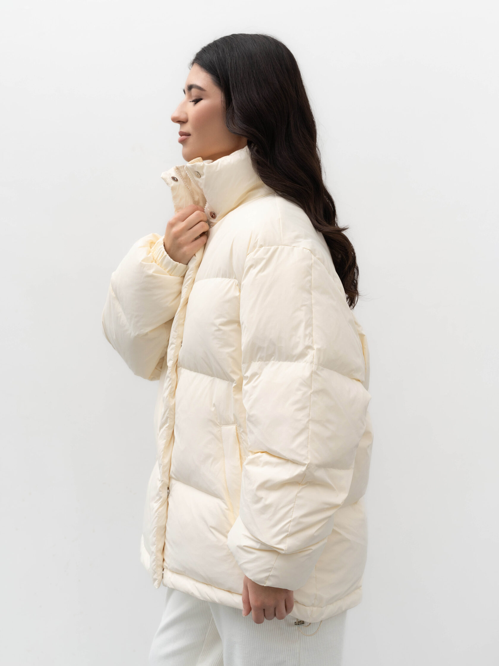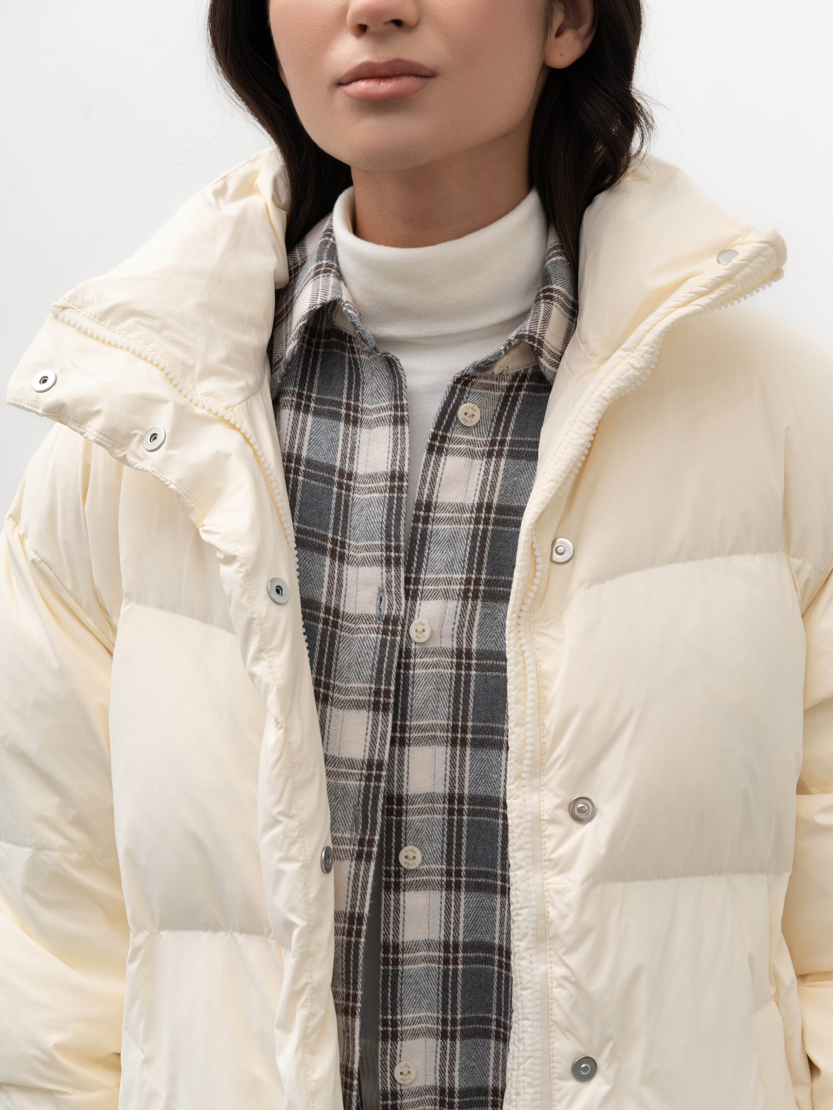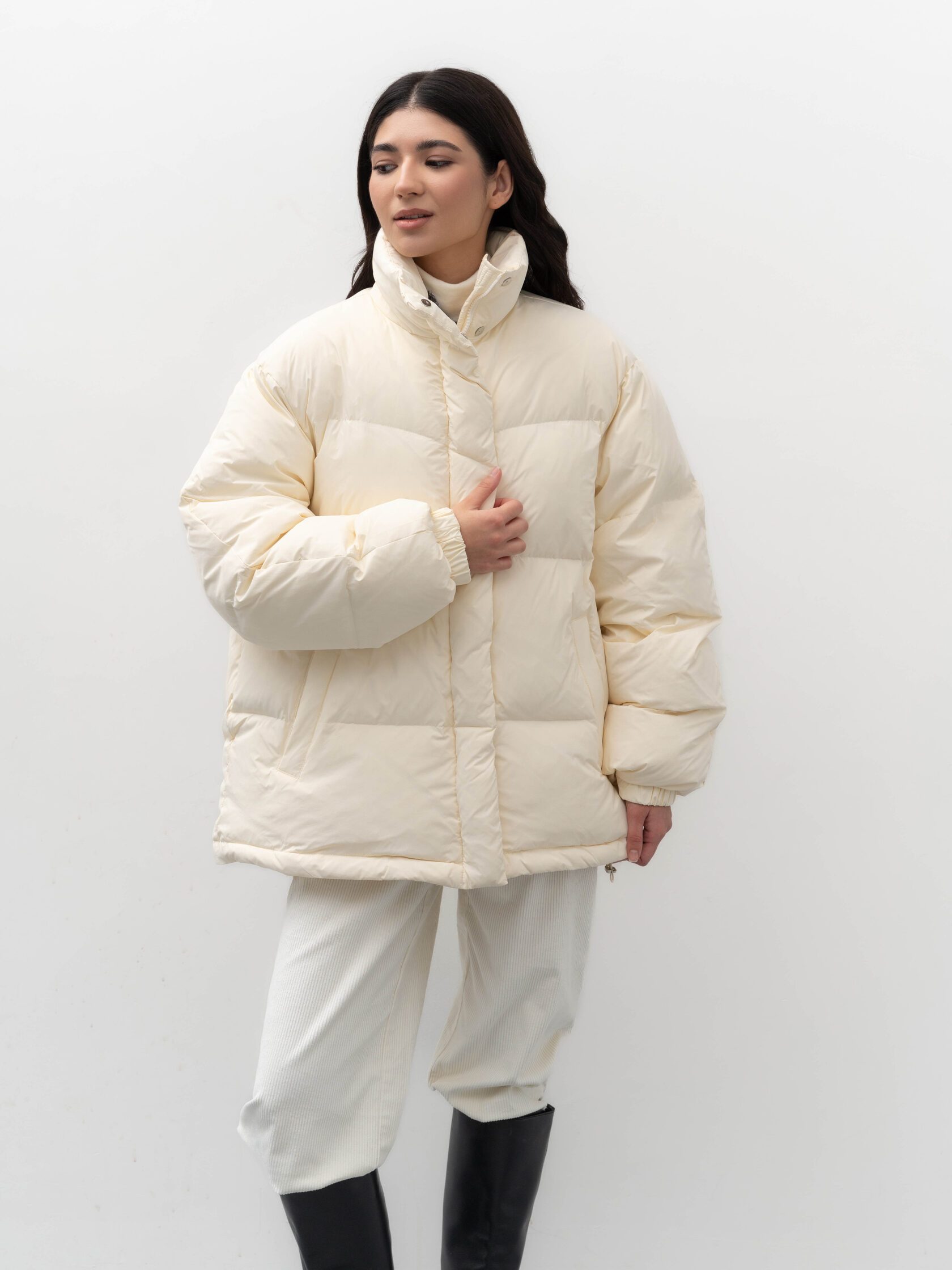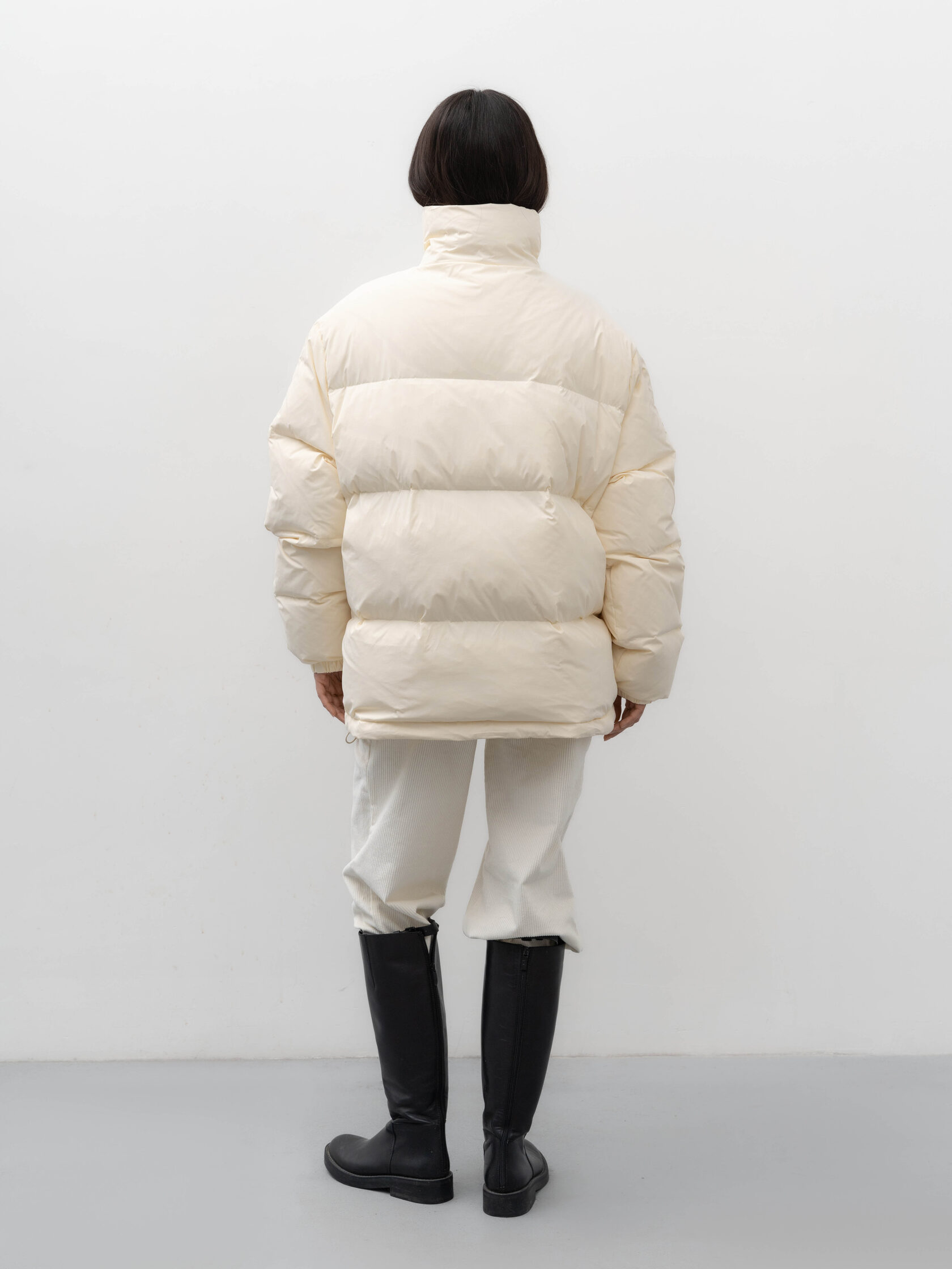 Молочный пуховик с наполнителем из пуха – мягкий, теплый и комфортный вариант для холодного времени года. Нежный оттенок придает образу свежесть, оставаясь универсальным элементом зимнего гардероба, с которым можно создавать интересные цветовые сочетания.