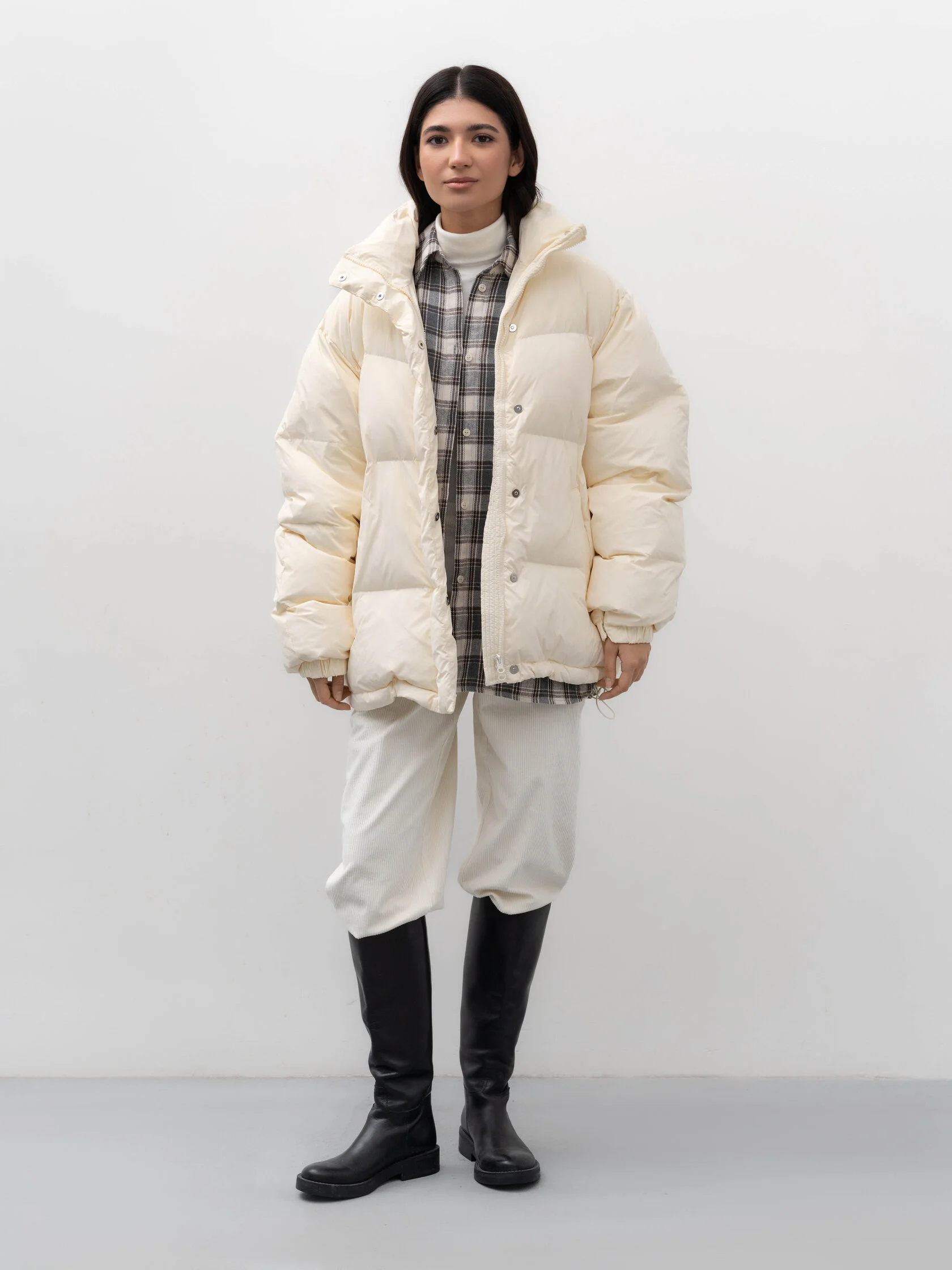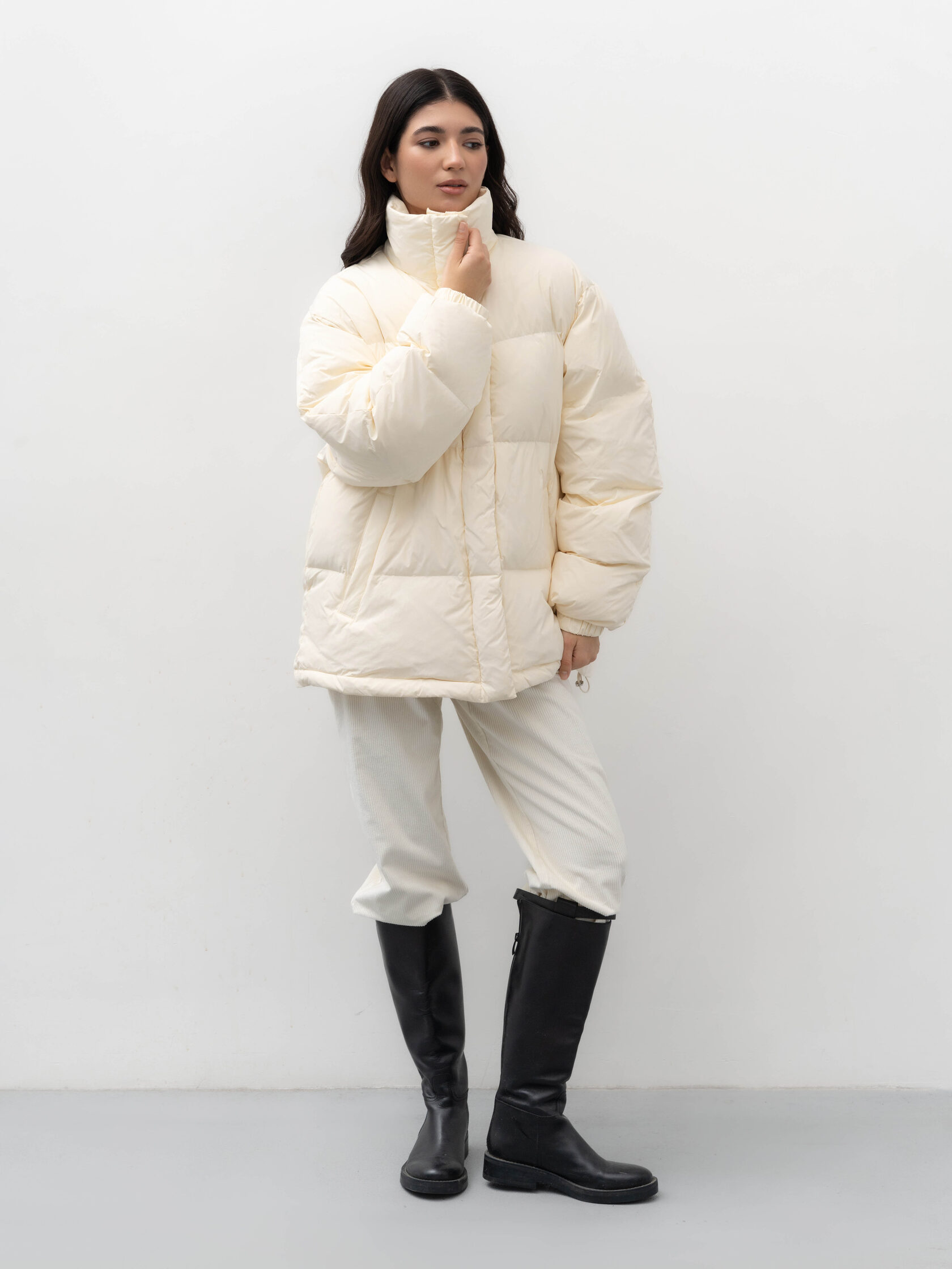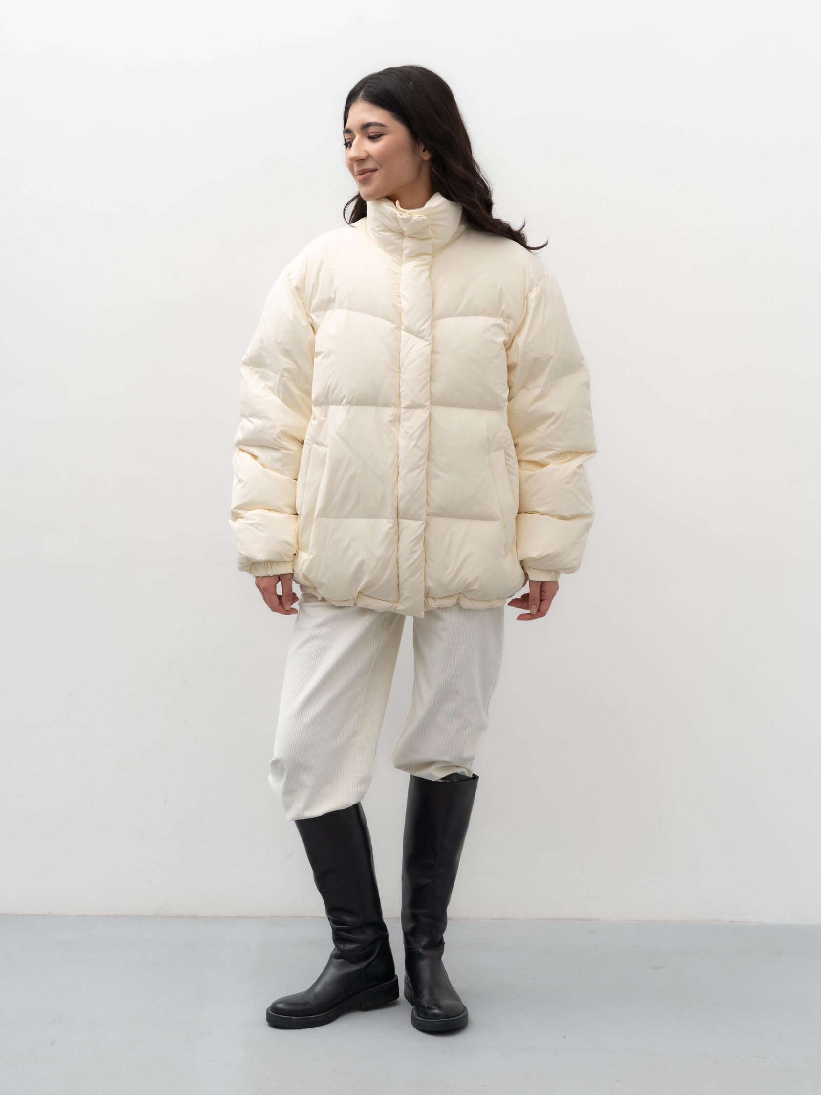 Молочный пуховик с наполнителем из пуха – мягкий, теплый и комфортный вариант для холодного времени года. Нежный оттенок придает образу свежесть, оставаясь универсальным элементом зимнего гардероба, с которым можно создавать интересные цветовые сочетания.
