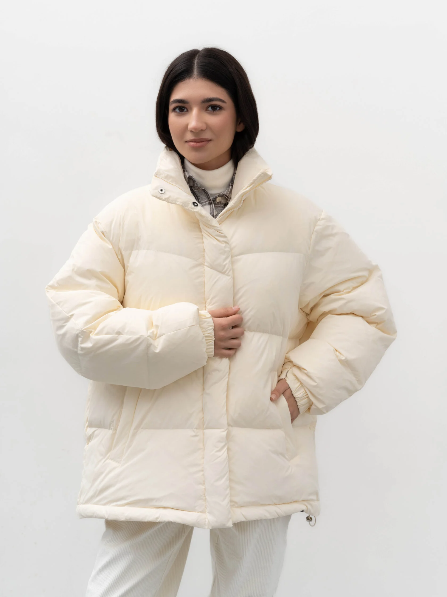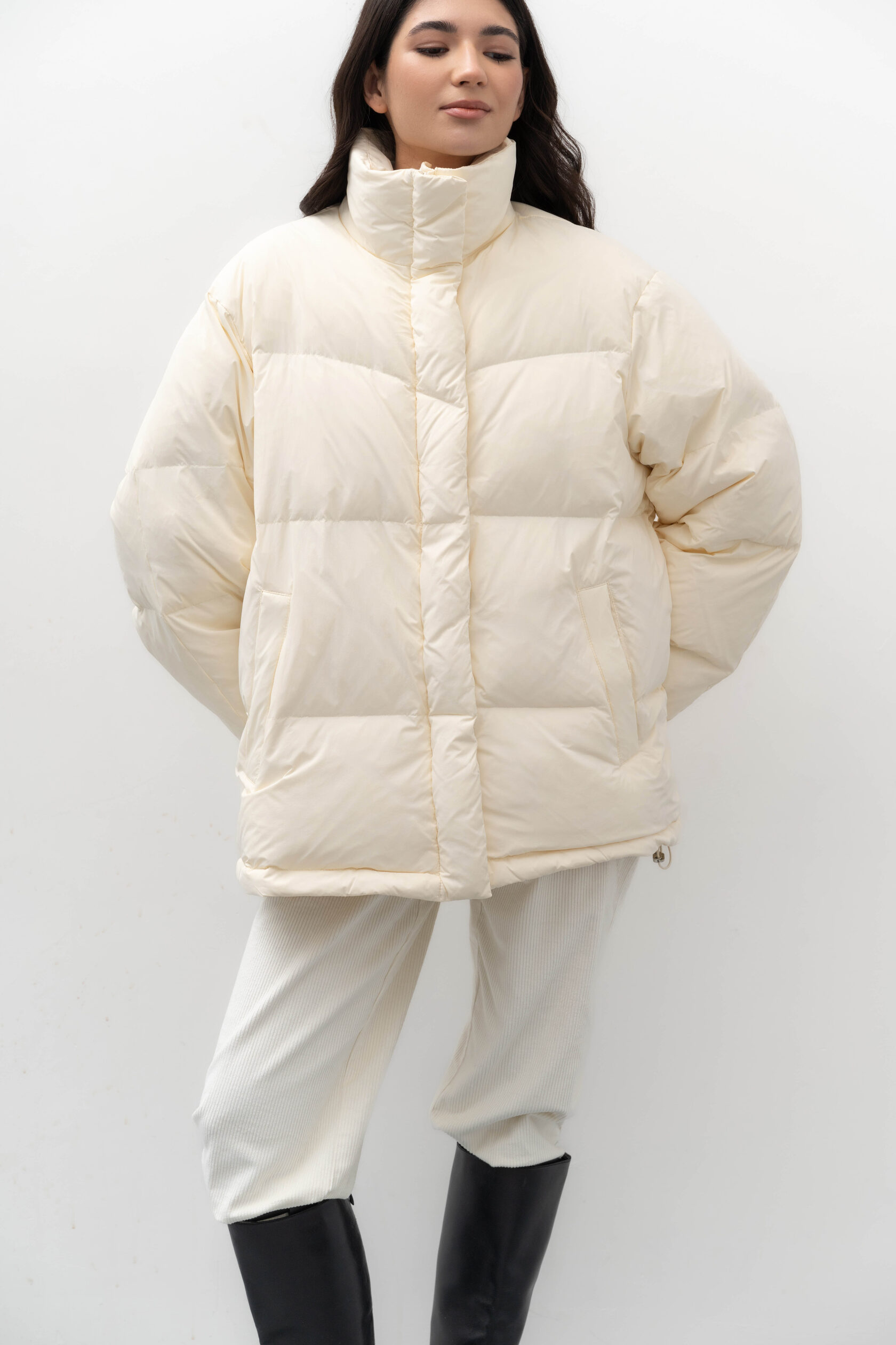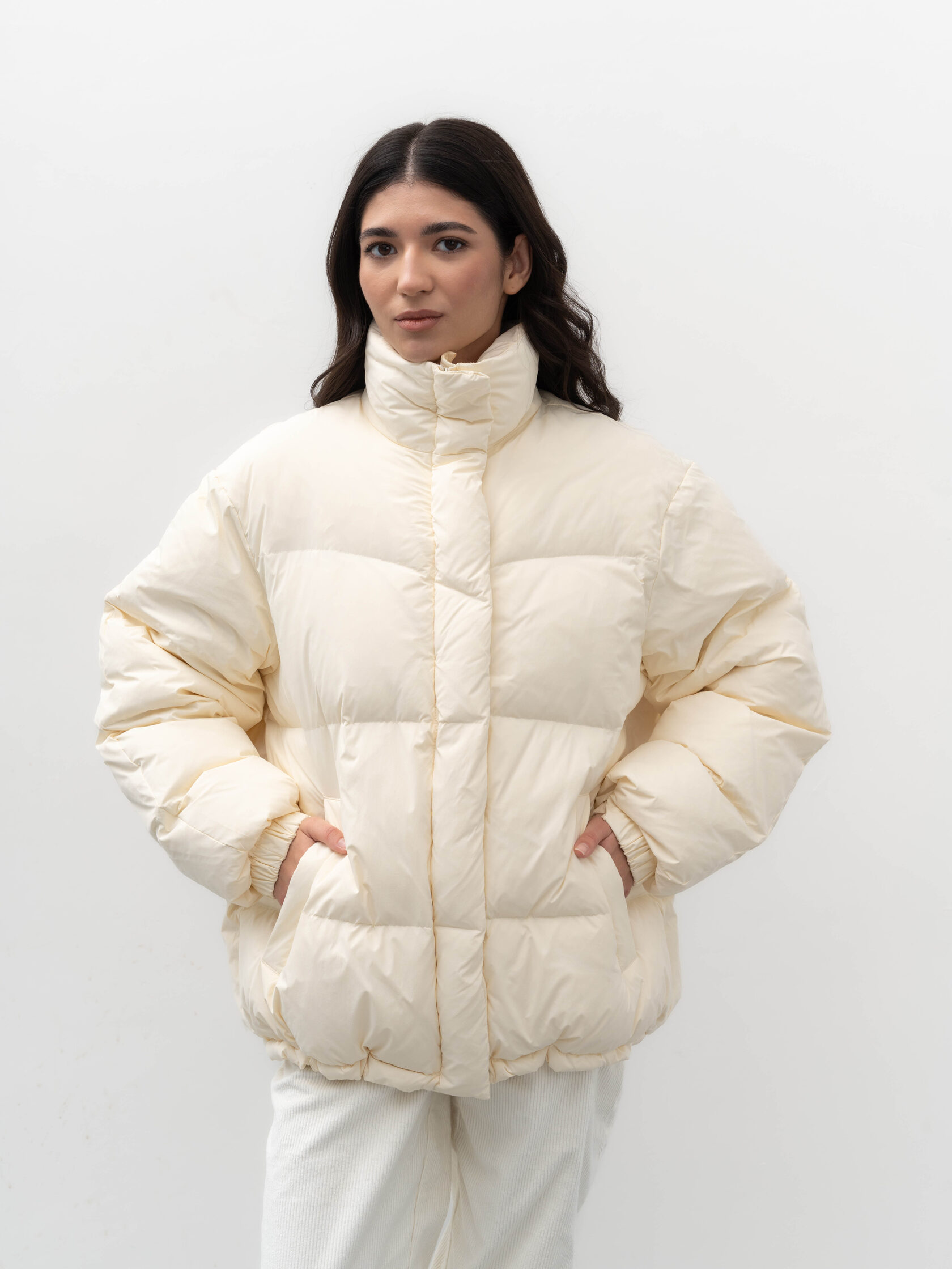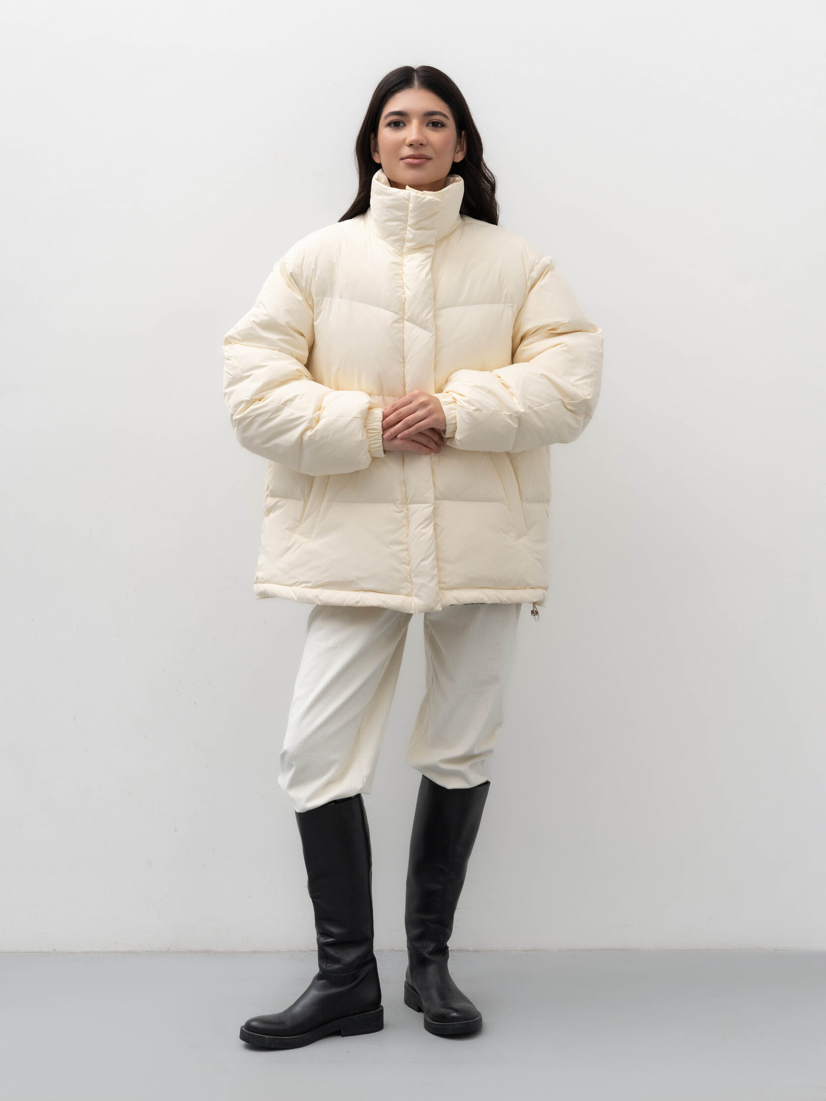 Молочный пуховик с наполнителем из пуха – мягкий, теплый и комфортный вариант для холодного времени года. Нежный оттенок придает образу свежесть, оставаясь универсальным элементом зимнего гардероба, с которым можно создавать интересные цветовые сочетания.