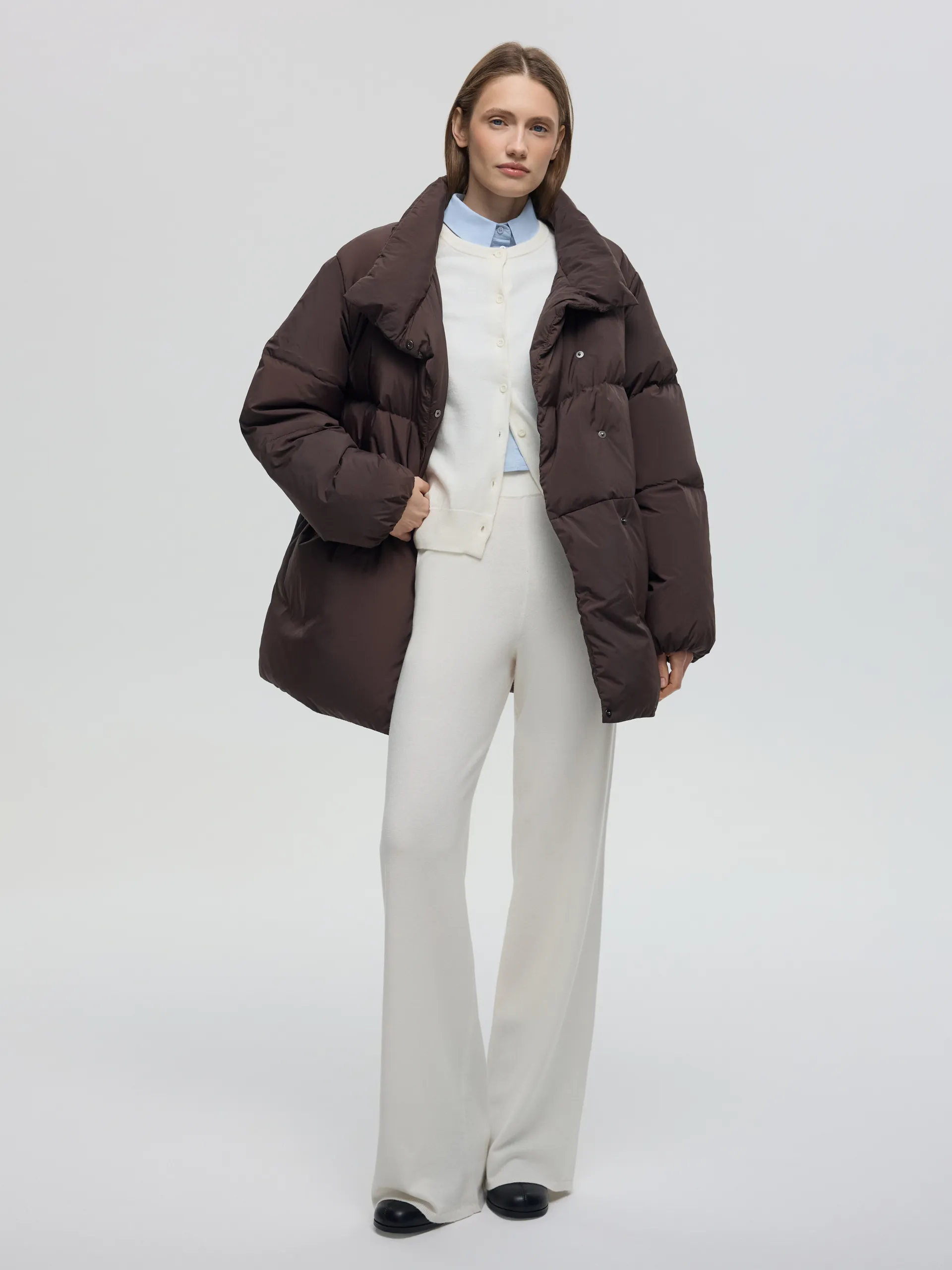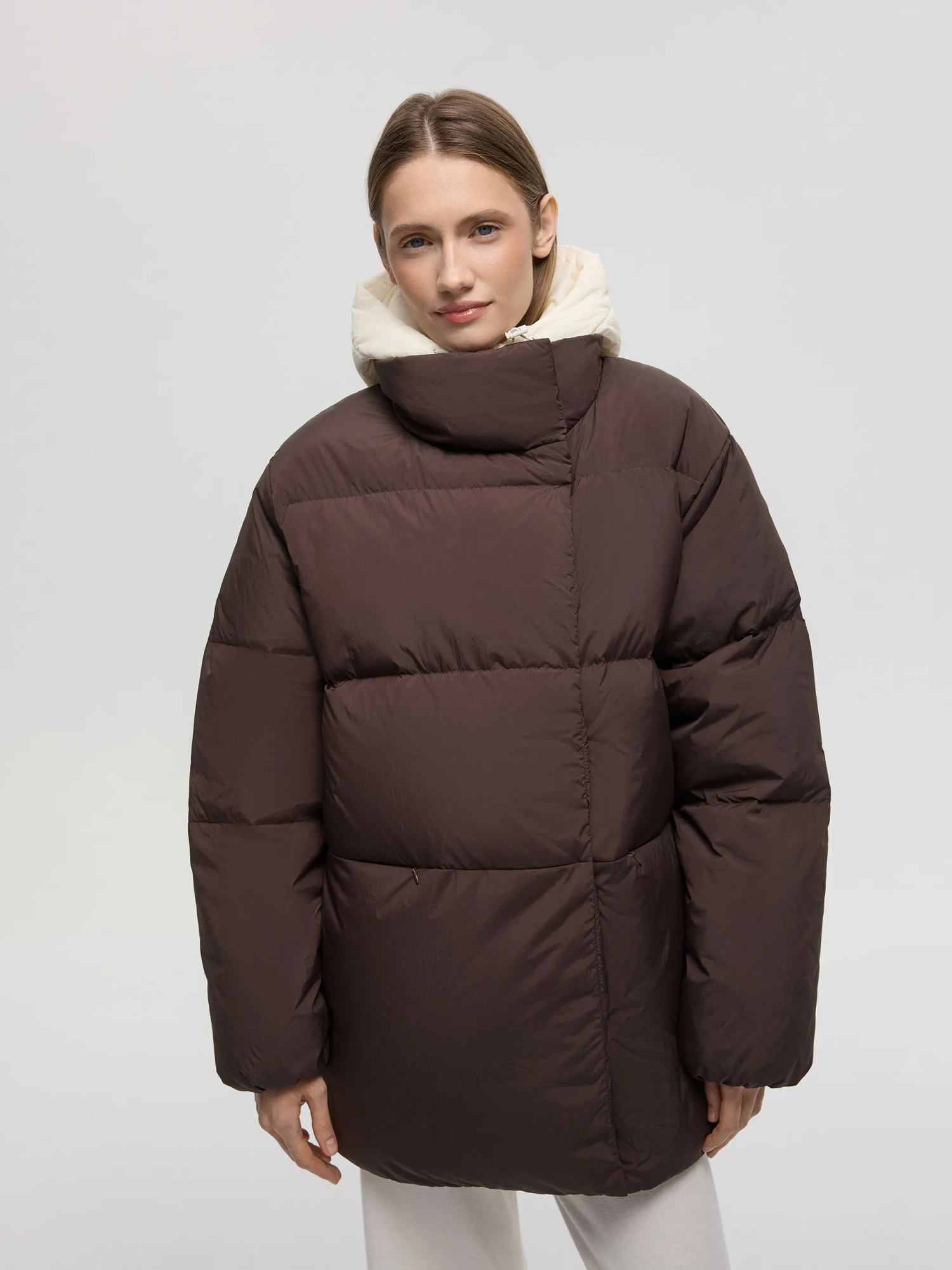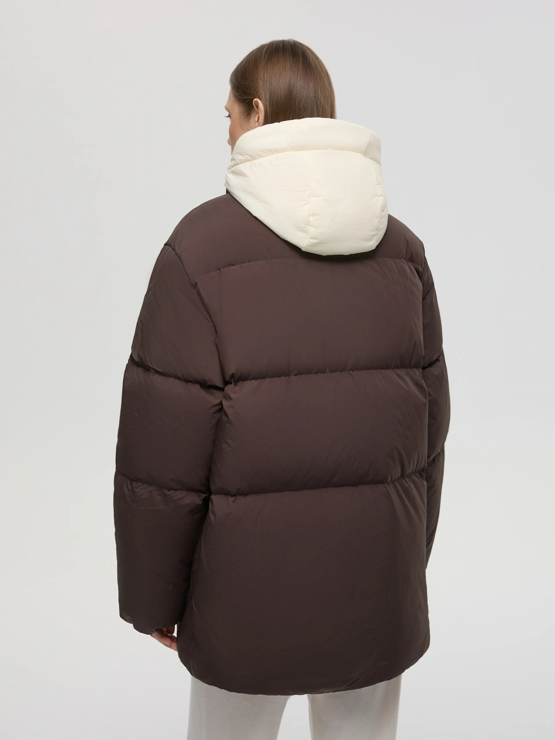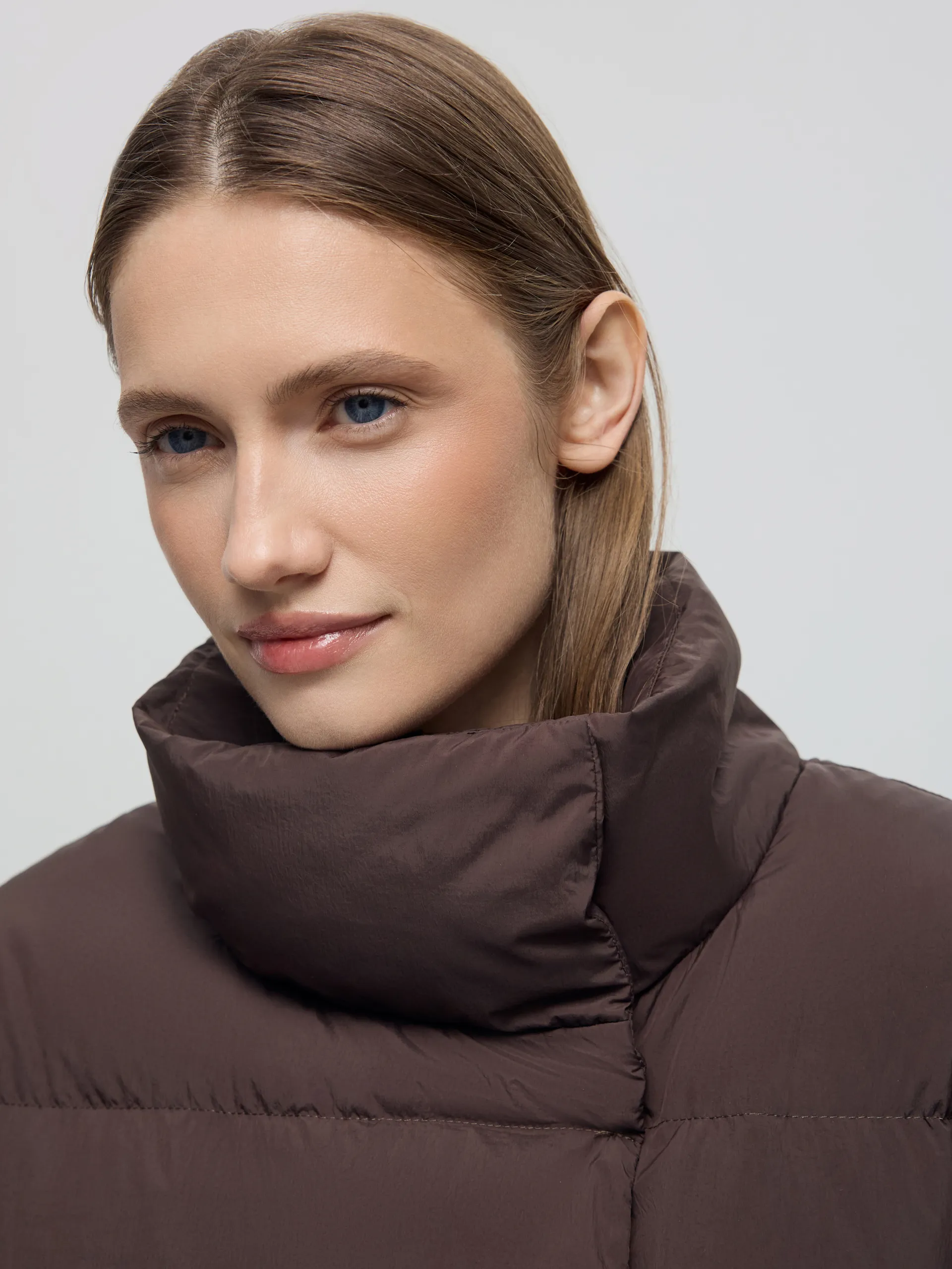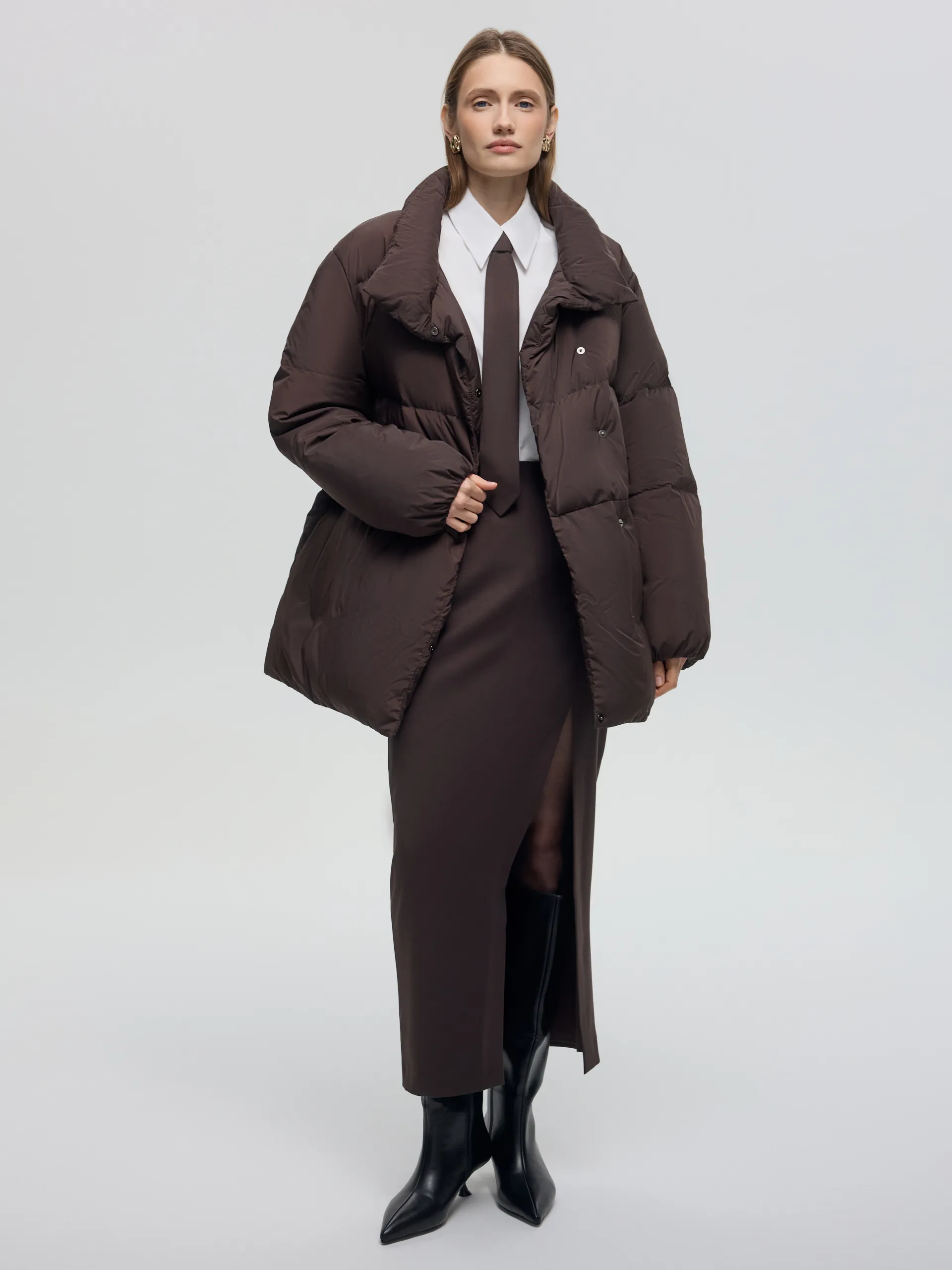 Пуховик Ruth. Коричневый пуховик со съёмной манишкой — тёплая, лёгкая и практичная модель на каждый день. Наполнитель 90% пух, 10% перо обеспечивает высокий уровень теплоизоляции, сохраняя комфорт даже при низких температурах. Потайные карманы на молнии не только поддерживают минималистичный вид, но и защищают от снега и влаги, что делает модель ещё более функциональной. Съёмная манишка позволяет адаптировать пуховик под погоду и настроение: носить полностью закрытым для максимального тепла или более лаконично — без неё. Пуховик легко сочетать с джинсами, трикотажем и шерстяными аксессуарами, создавая уютные и современные зимние образы.