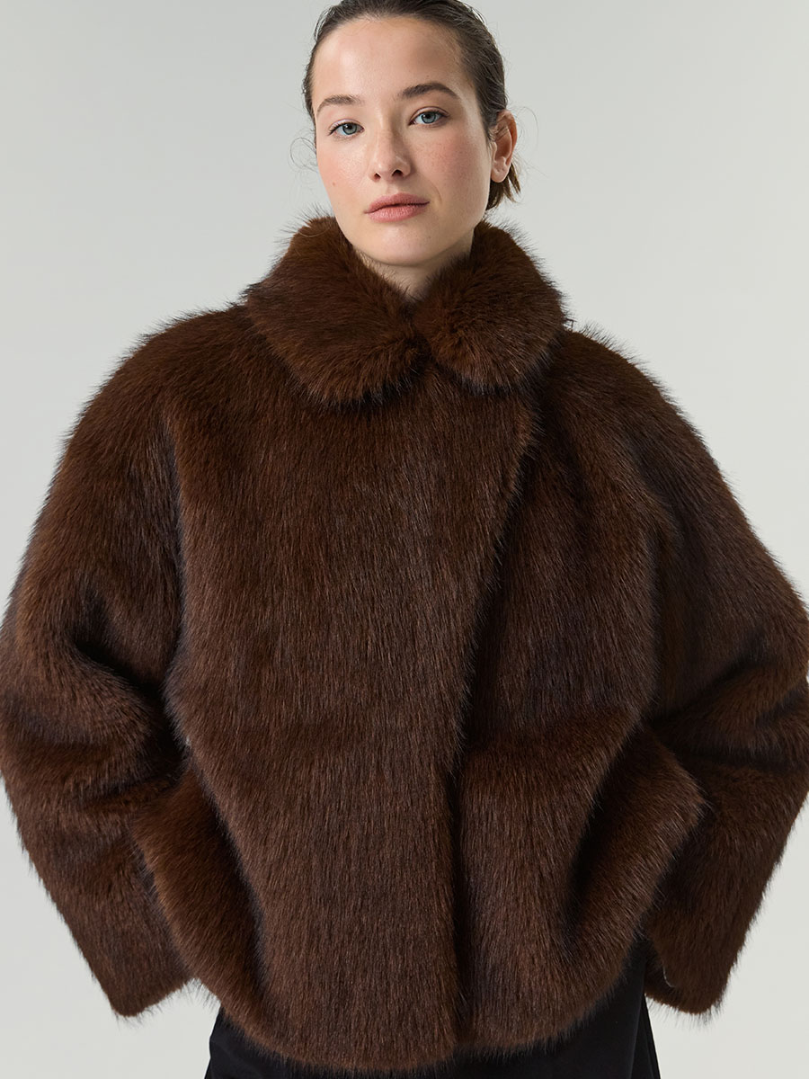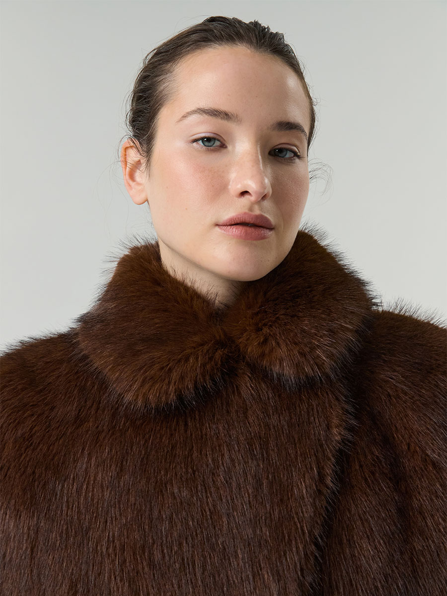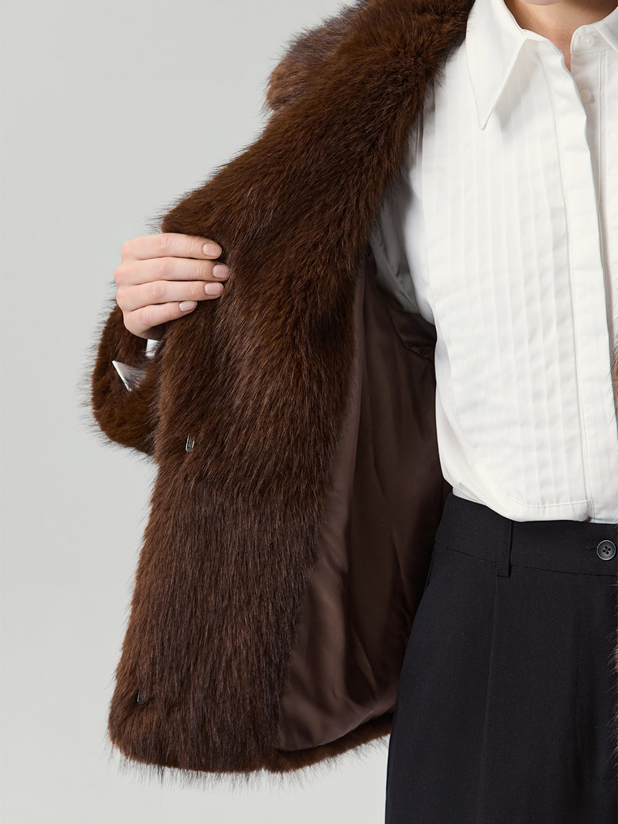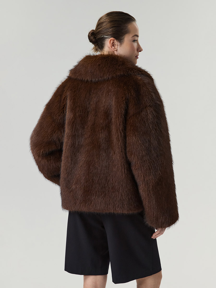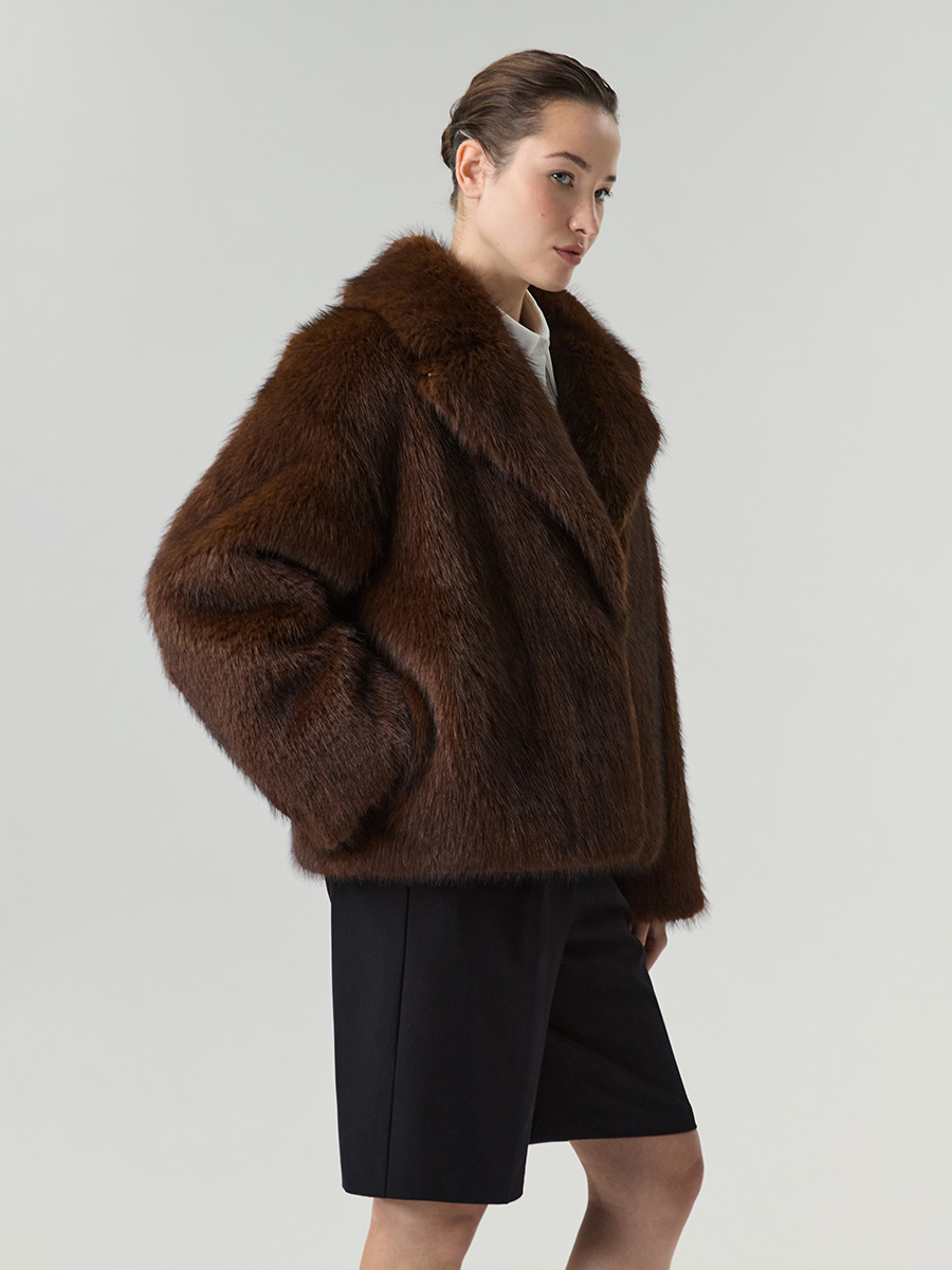 Укороченная шуба из пушистого экомеха под песца красивого неоднородного каштанового оттенка. Практична за счёт удобной длины, универсальна в стилизации, комфортна благодаря оверсайзу и роскошна по дизайну — сделает любой образ наряднее и богаче.