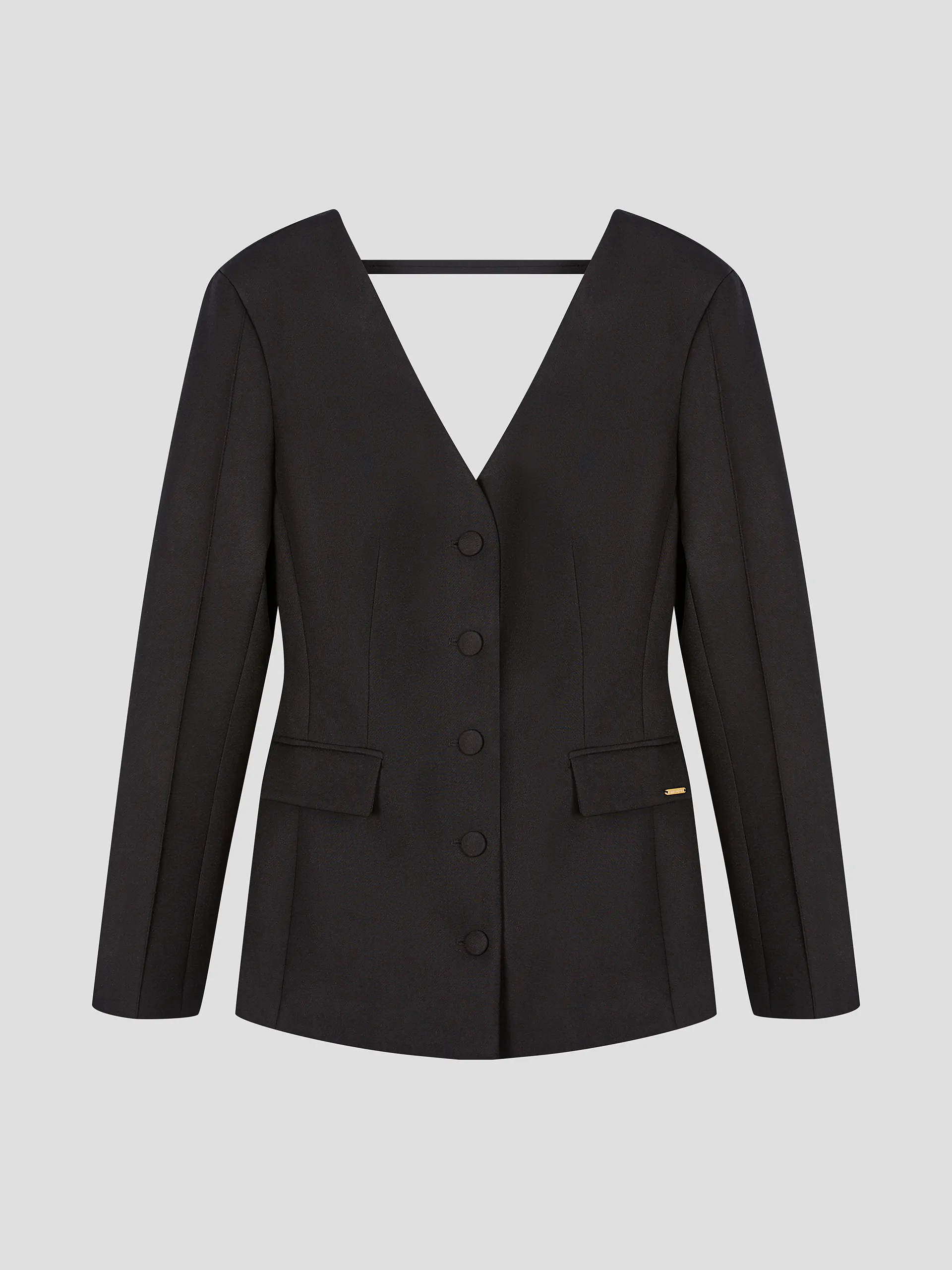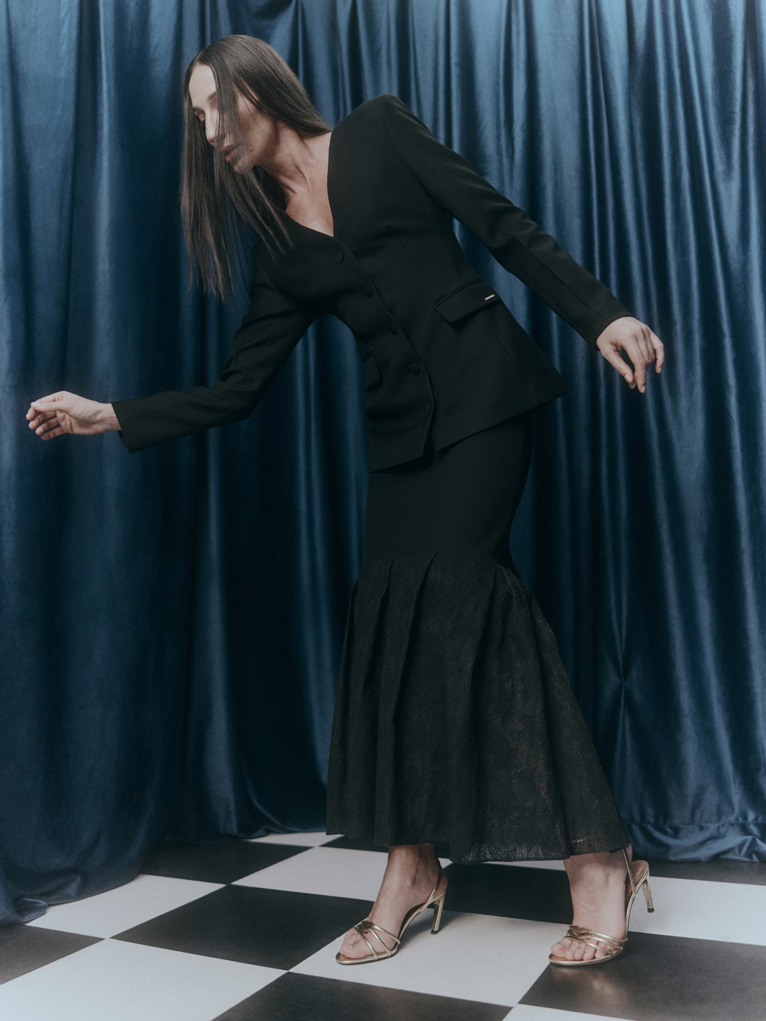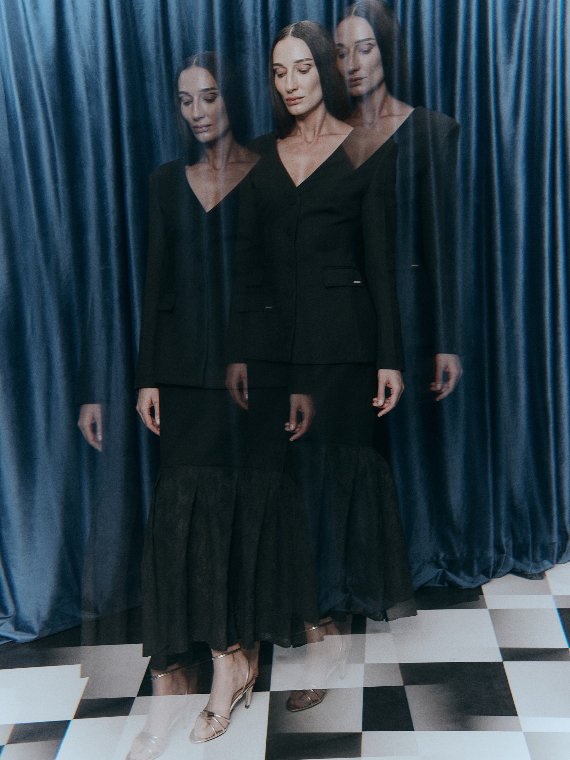 Жакет Idana — элегантная модель с выразительным вырезом на спине, выполненная в глубоком чёрном оттенке. Приталенный силуэт подчёркивает фигуру, а слегка увеличенная линия плеч добавляет структуру и современный акцент. Жакет легко интегрируется как в вечерние, так и в повседневные образы: он гармонично сочетается с брюками-клёш, палаццо, денимом, а также с мини и мидакси-юбками из коллекции. Идеальный вариант — собрать комплект с юбкой Idana, создавая лаконичный и выразительный образ.